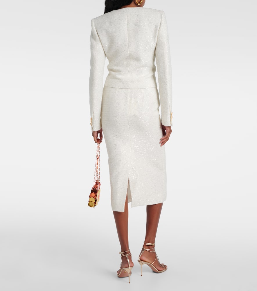 Material: 39% polyamide, 27% polyester, 17% acrylic, 15% wool, 2% mohair. Care instructions: dry clean. Made in Italy. Designer color name: White. Lining: 100% viscose. Closure: buttoned front. Shop the latest Alessandra Rich Blazers.