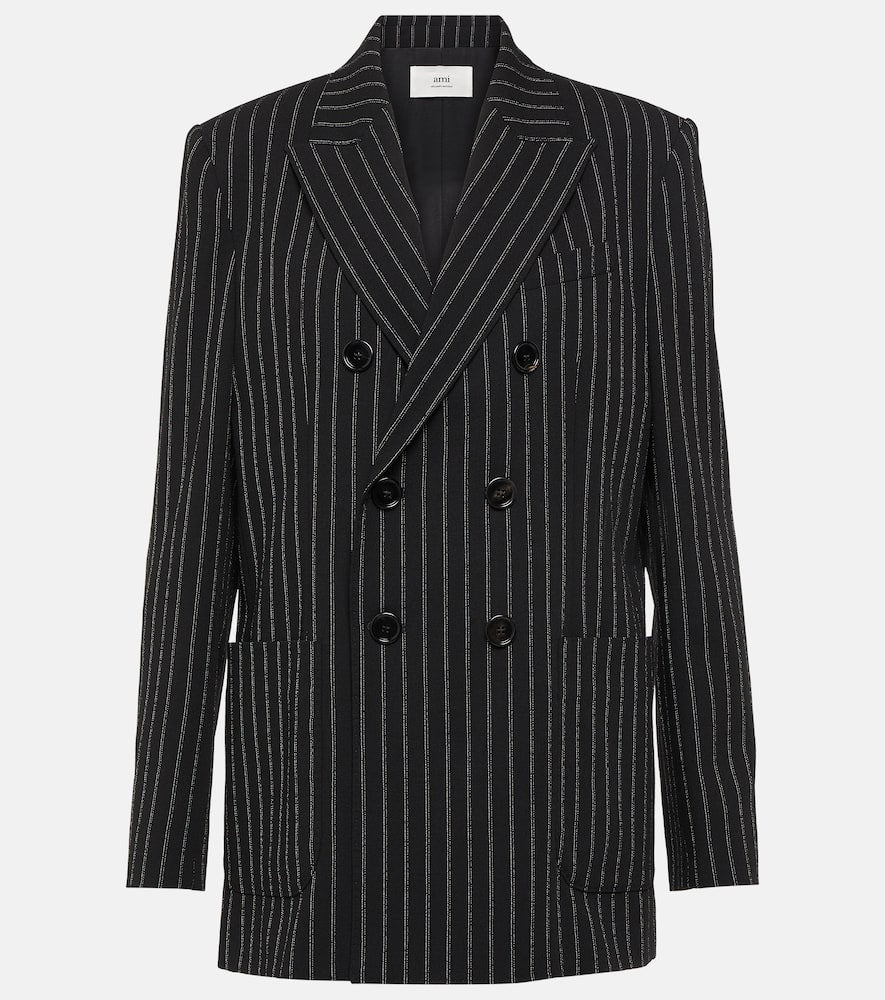 Material: 100% wool. Care instructions: dry clean. Made in Romania. Designer color name: Black/Chalk. Lining: 50% cotton, 50% polyester. Sleeve lining: 54% acetate, 45% viscose, 1% polyester. Pocket lining: 65% polyester, 35% cotton. Closure: double-breasted buttoned front. Pockets: breast pocket, patch pockets, internal pockets. Contains non-textile parts of animal origin. Shop the latest Ami Paris Blazers.