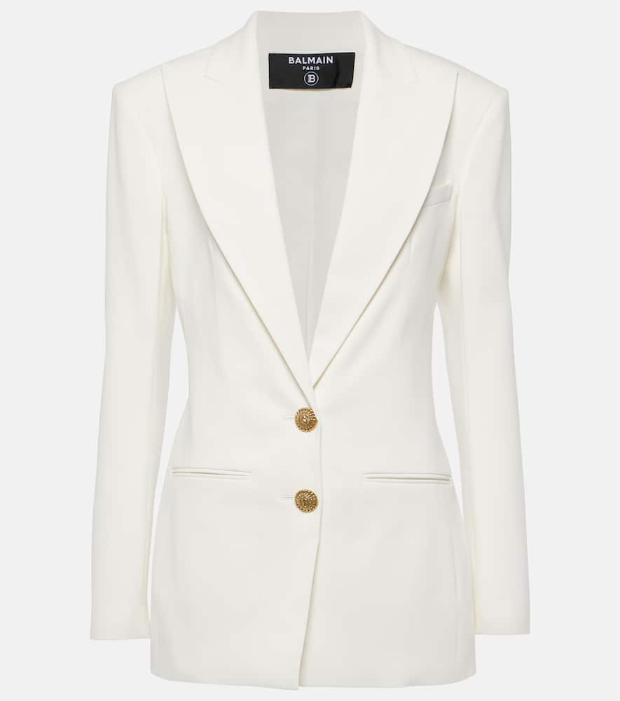 Material: 97% viscose, 3% elastane. Care instructions: dry clean. Made in Slovakia. Designer color name: Blanc. Lining: 52% viscose, 48% cotton. Closure: single-breasted (two buttons). Peak lapel. Pockets: welt pockets, breast pocket. Shoulder pads. Shop the latest Balmain Blazers.