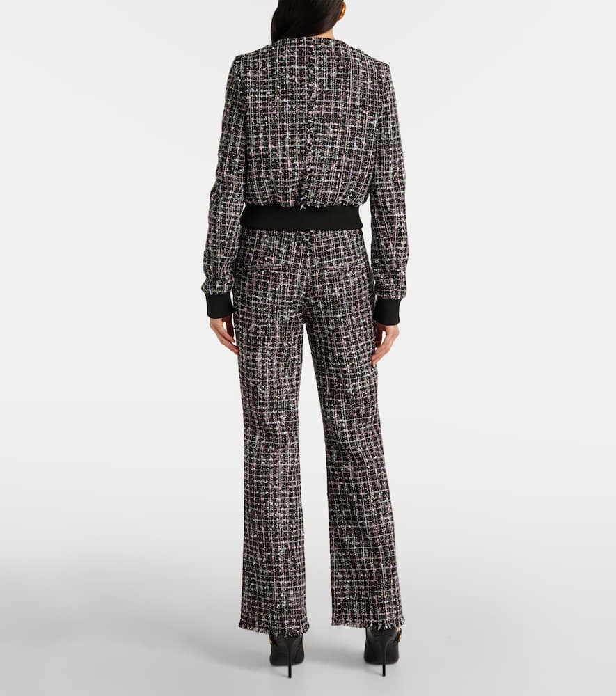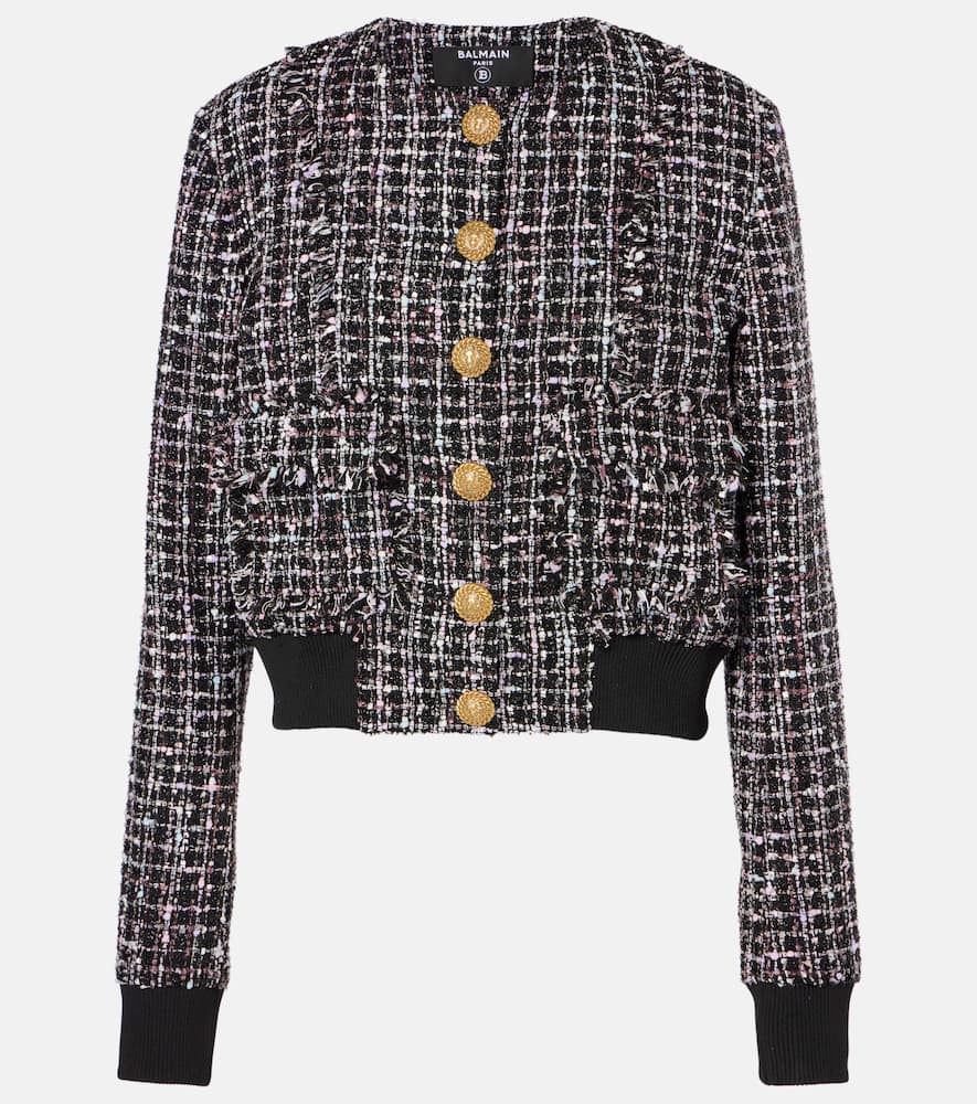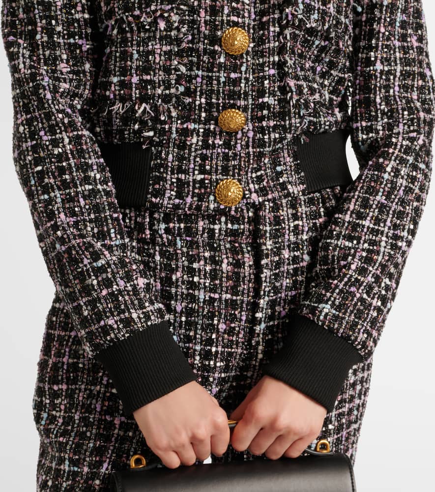 Material: 76% polyester, 10% viscose, 8% cotton, 5% other fibres, 1% metallic fibres. Care instructions: dry clean. Made in Moldova. Designer color name: Eah Noir/Multico. Closure: buttoned front. Pockets: flap pockets. Lining: 65% acetate, 35% viscose. Details: 90% polyester, 7% polyamide, 3% elastane. Shop the latest Balmain Tweed Jackets.