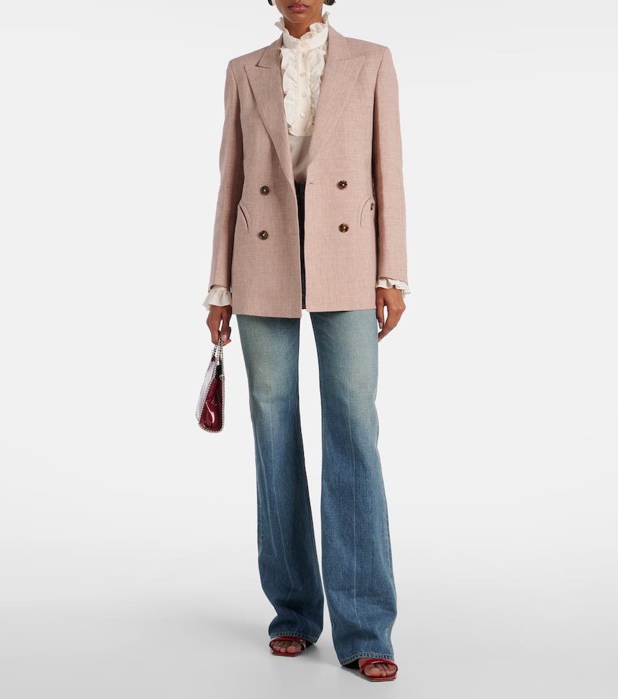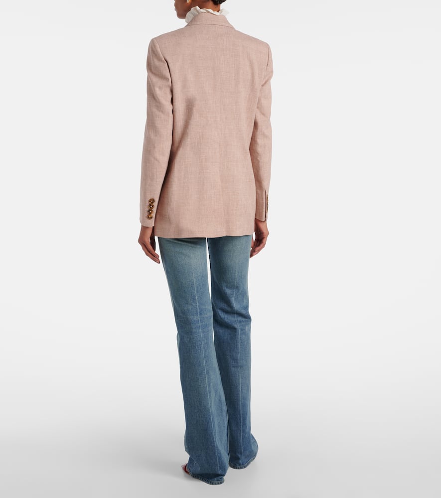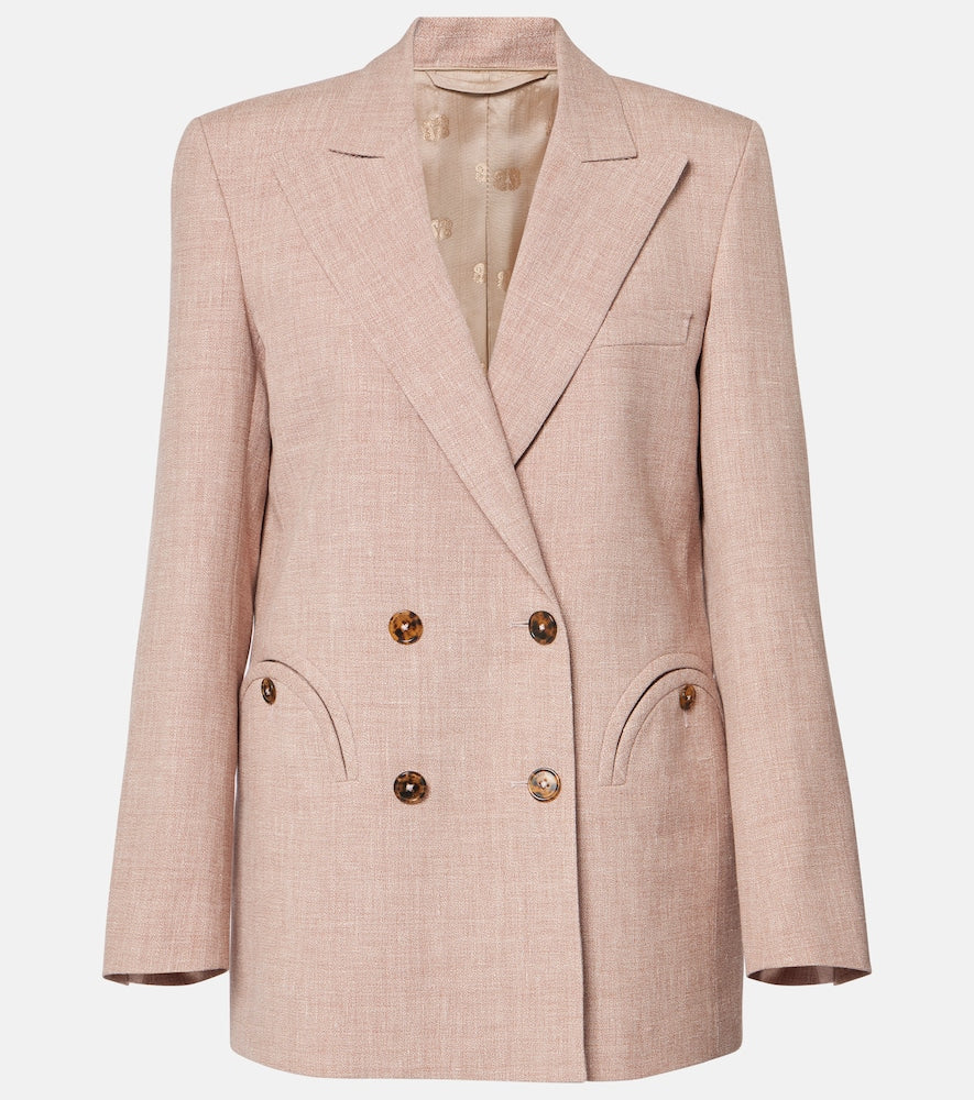 Material: 68% linen, 32% wool. Care instructions: dry clean. Made in Italy. Designer color name: Sand. Comes with garment bag. Closure: double-breasted (four buttons). Pockets: buttoned pockets. Lining: 100% viscose. Shoulder pads. Shop the latest Blaze Milano Blazers.