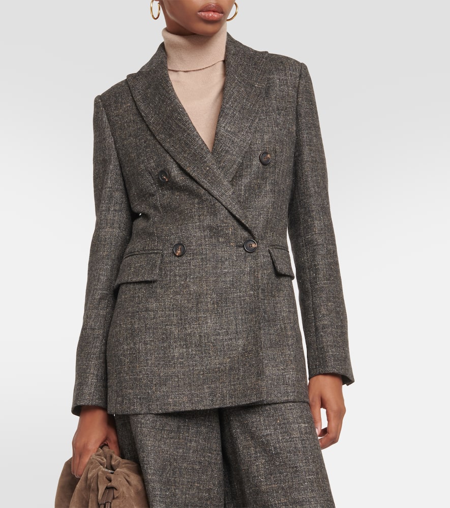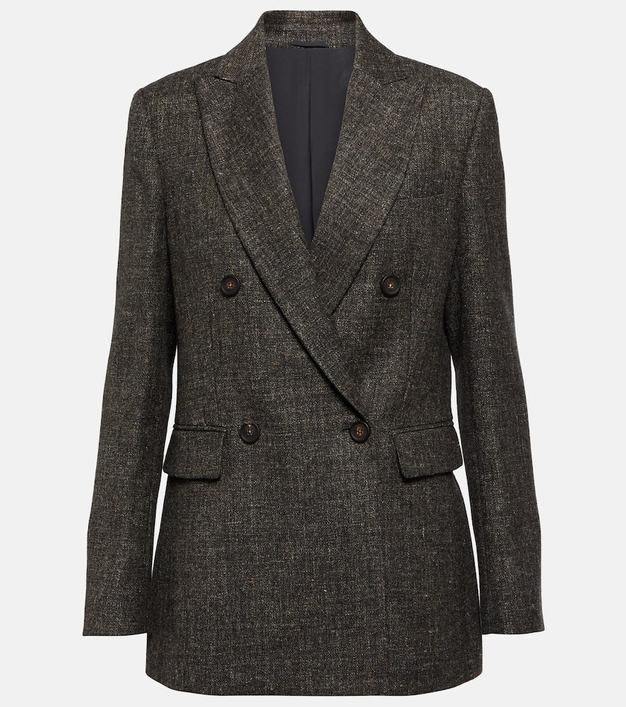 Made in Italy. Closure: double-breasted buttoned front. Care instructions: dry clean. Designer color name: Grigio Macro Melange. Pockets: flap pockets. Buttoned cuffs. Material: 27% linen, 18% polyamide, 45% virgin wool, 10% cotton. Shop the latest Brunello Cucinelli Blazers.