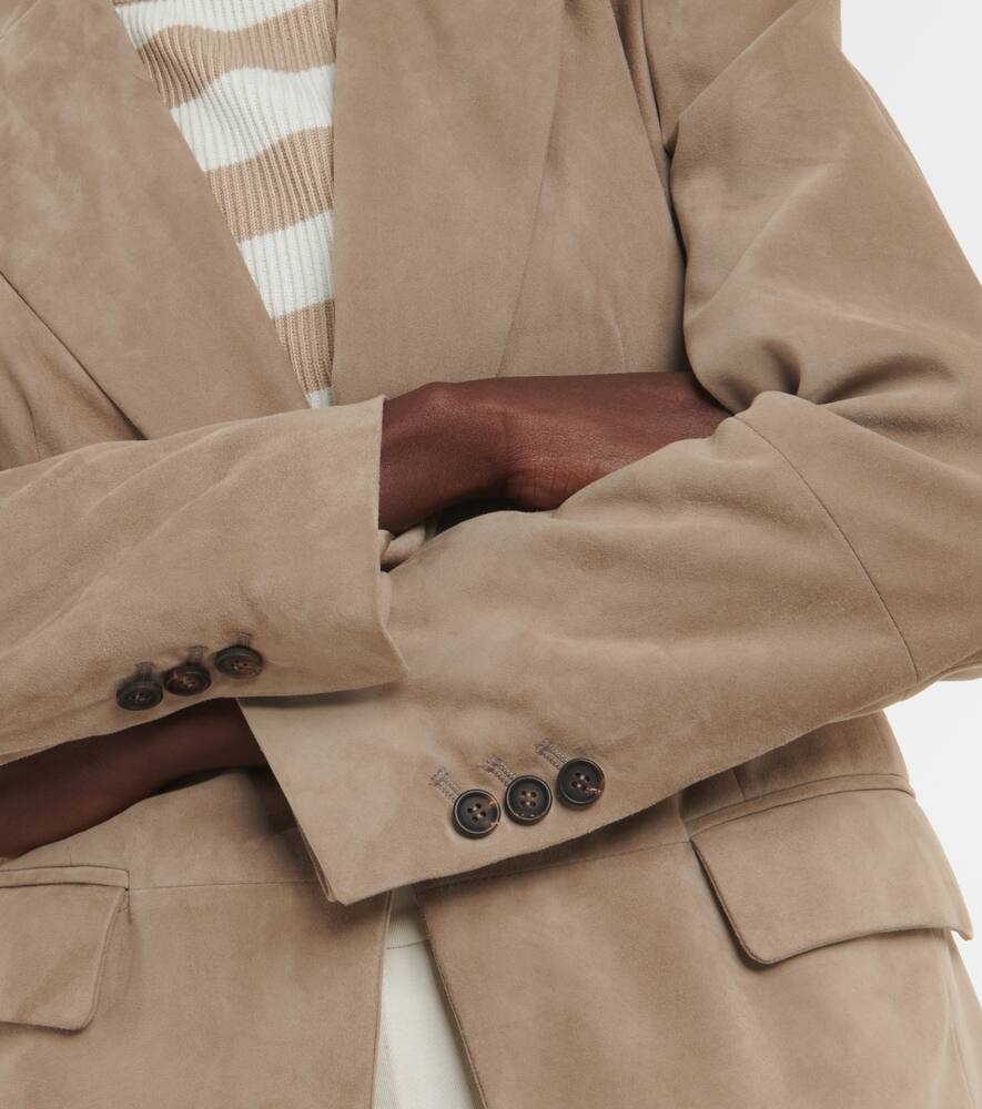 Material: 100% leather. Care instructions: specialist clean. Made in Italy. Designer color name: Taupe. Lining: 74% acetate, 26% silk. Sleeve lining: 65% acetate, 35% polyester. Insert: 100% brass. Contains non-textile parts of animal origin. Closure: single-breasted (one button). Pockets: flap pockets. Buttoned cuffs. Comes with garment bag. Shop the latest Brunello Cucinelli Blazers.