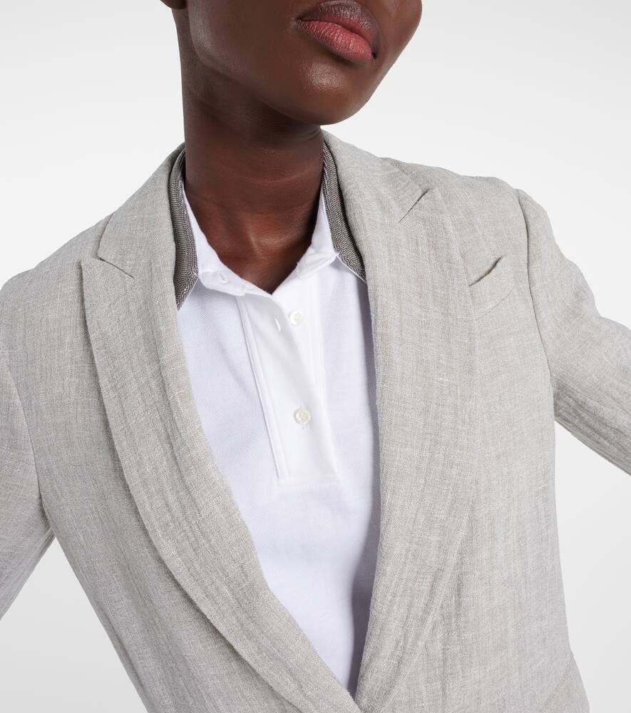Material: 90% linen, 10% polyamide. Care instructions: dry clean. Made in Italy. Designer color name: Grigio. Lining: 74% acetate, 26% silk. Sleeve lining: 65% acetate, 35% polyester. Closure: buttoned front. Pockets: flap pockets. Shop the latest Brunello Cucinelli Blazers.