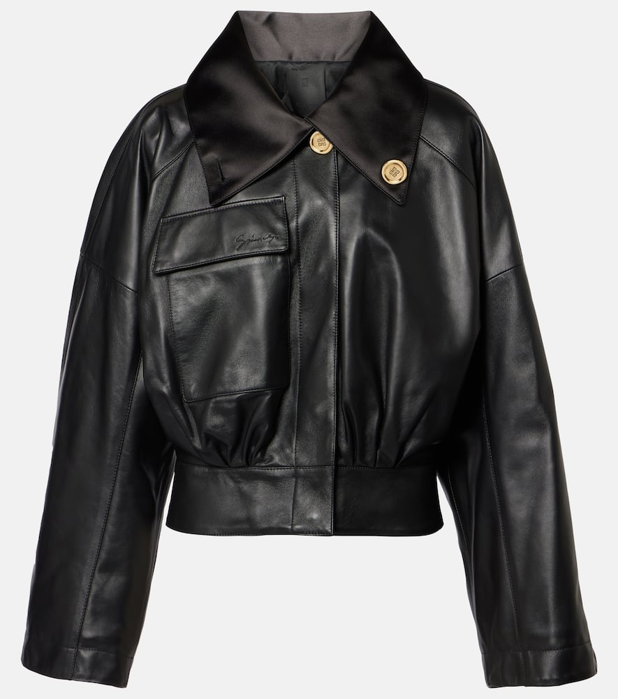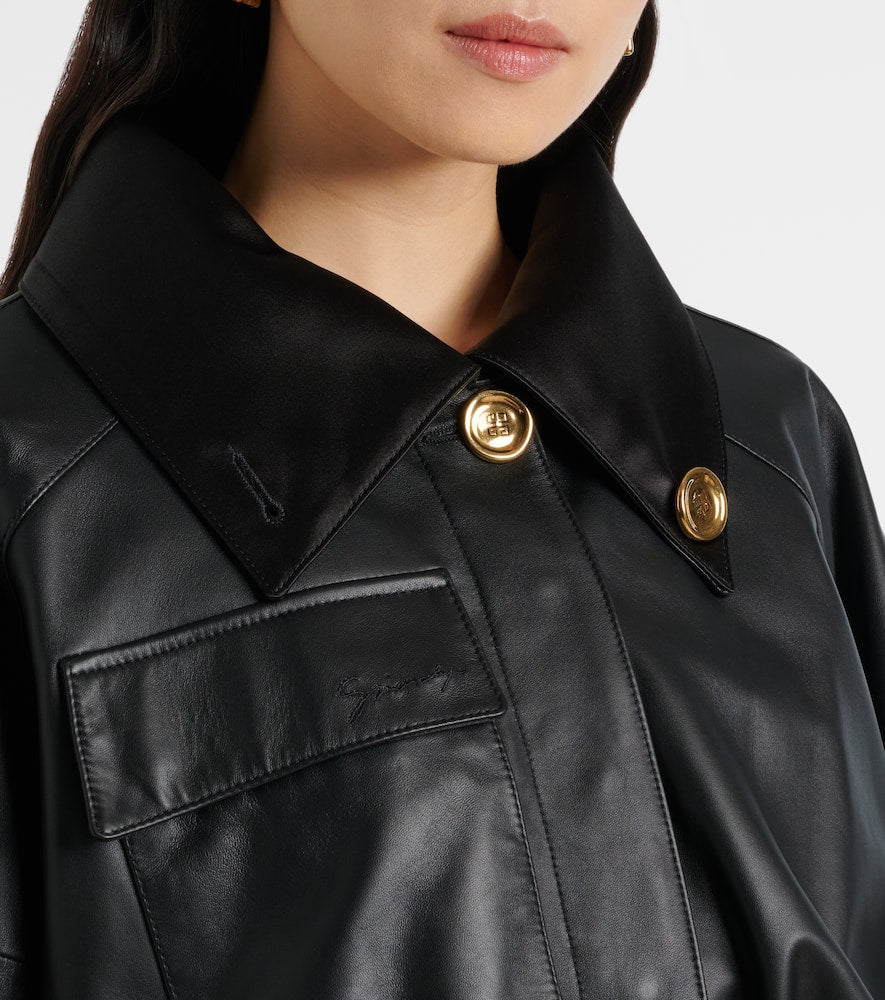 Material: 100% leather. Care instructions: specialist clean. Made in Romania. Designer color name: Black. Material II: 72% viscose, 28% silk. Lining: 55% viscose, 45% polyester. Filling: 100% polyester. Closure: snap-buttoned front. Shop the latest Givenchy Leather Jackets.