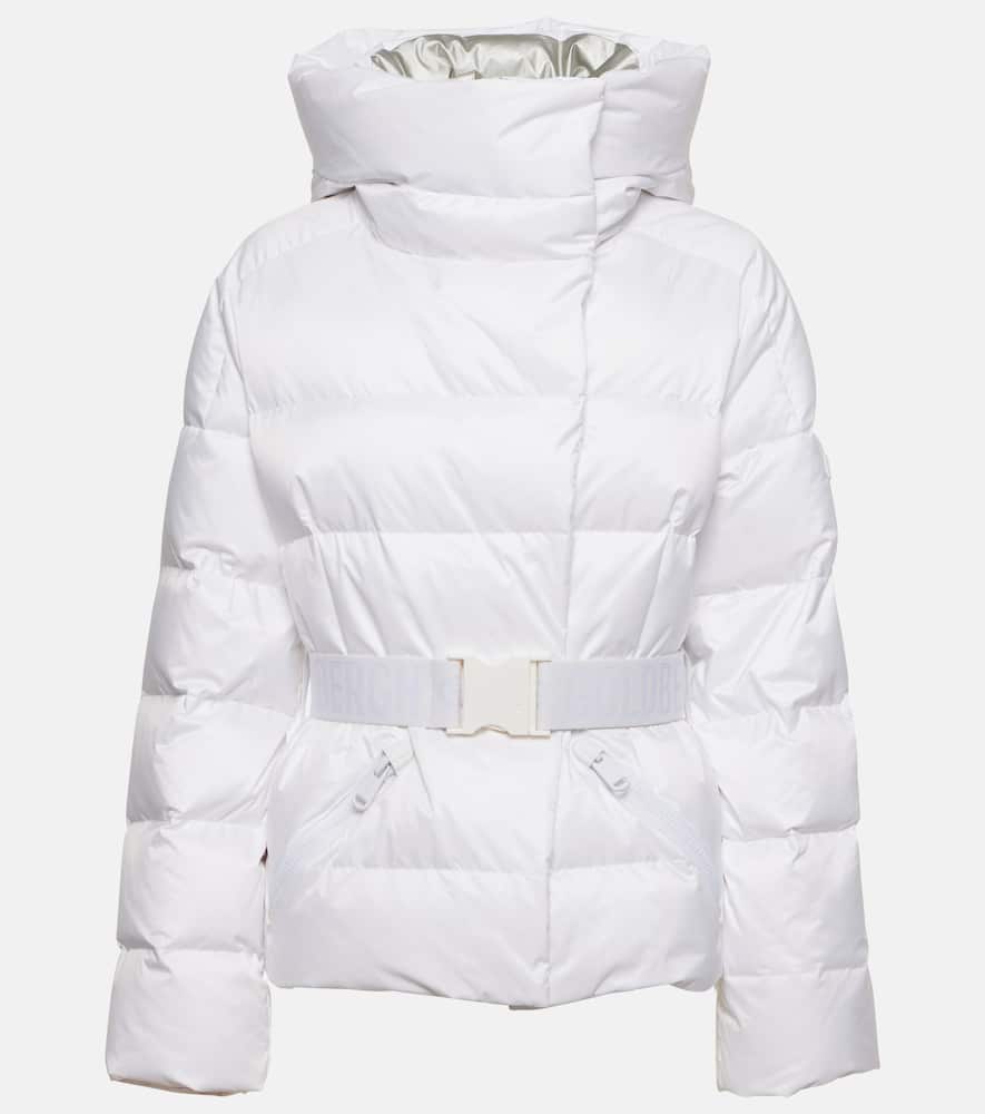 Material: 100% polyamide (recycled). Care instructions: machine wash at 30 degrees. Made in China. Designer color name: 8000 White. Lining: 58% polyester, 42% polyester (recycled). Lining II: 52% polyurethane, 48% polyester. Filling: 90% down, 10% feathers. Pockets: zipped pockets, sleeve pocket. Hood. Cuff: knit. Hem: elasticated. Closure: zipped front, snap-buttoned front. Attached belt. Contains non-textile parts of animal origin. Shop the latest Goldbergh Ski Jackets.