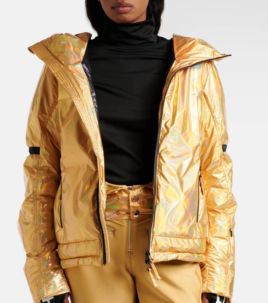 Material: 90% polyamide, 10% elastane. Care instructions: machine wash at 30 degrees. Made in Italy. Designer color name: Gold. Lining: 100% polyamide. Filling: 100% polyester. Trim: 94% polyester, 6% elastane. Ski jacket. Pockets: zipped pockets, ski-pass pocket. Closure: zipped front. Shop the latest Jet Set Ski Jackets.