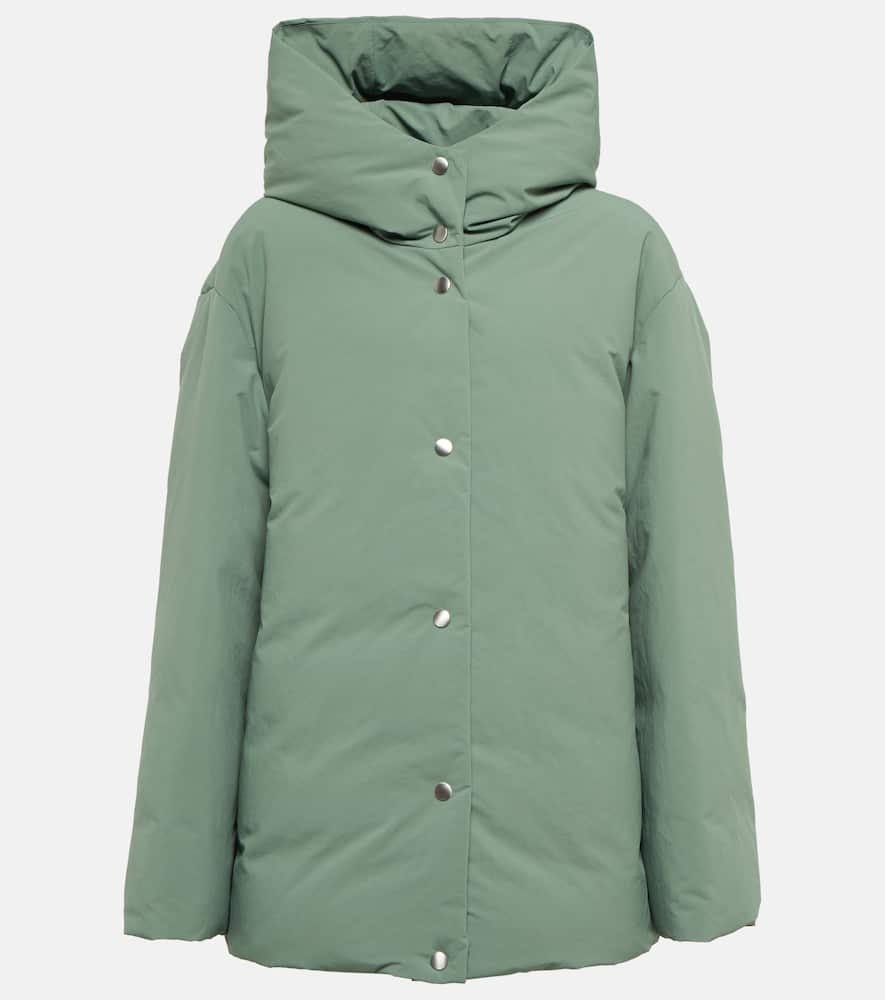 Lining: 100% polyester. Made in Italy. Closure: snap-buttoned front. Designer color name: Dark Sage. Material: 100% polyester. Contains non-textile parts of animal origin. Filling: 85% down, 15% goose feathers. Pockets: side slit pockets. Drawstring at the hem for adjustable fit. Care instructions: dry clean. Shop the latest Jil Sander Puffer & Down Jackets.