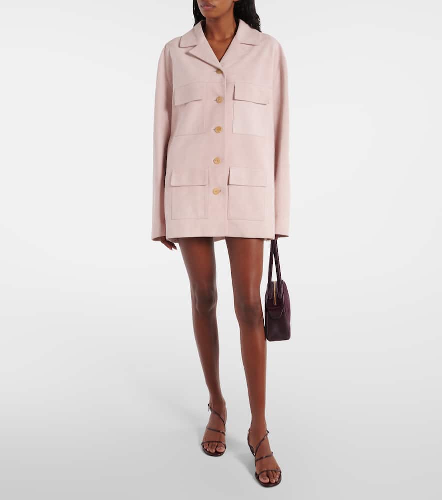 Material: 100% lamb leather. Care instructions: dry clean. Made in Romania. Designer color name: Soft Pink. Closure: buttoned front. Pockets: patch pockets. Shop the latest Khaite Leather Jackets.