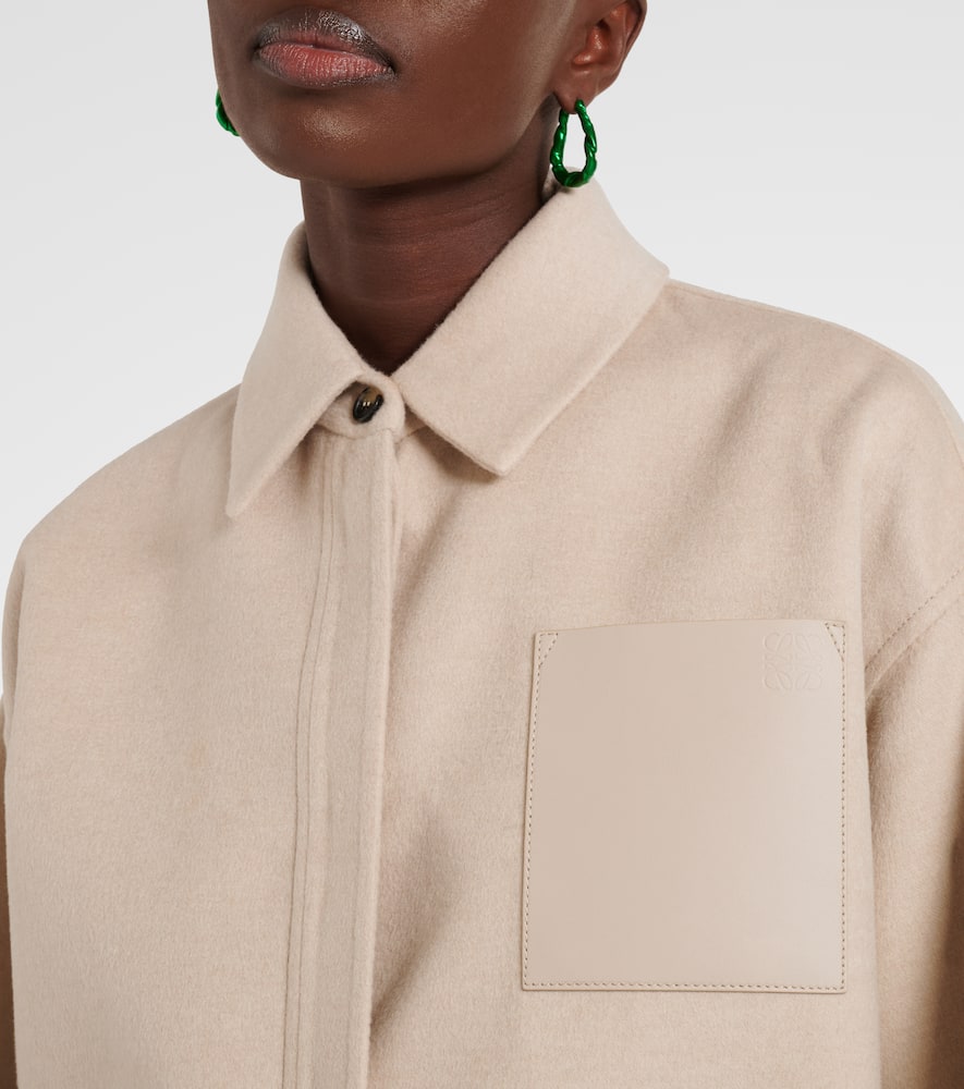 Material: 90% wool, 10% cashmere. Care instructions: dry clean. Made in Italy. Designer color name: Light Beige Melange. Closure: snap-buttoned front. Pockets: side slit pockets. Trim: 100% leather. Pocket lining: 100% cotton. Material II: 100% viscose. Buttoned cuffs. Shop the latest Loewe Overshirts & Utility Jackets.