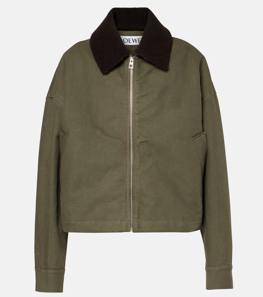 Material: 100% cotton. Care instructions: dry clean. Made in Italy. Designer color name: Khaki Green. Closure: zipped front. Pockets: side slit pockets, internal pockets. Buttoned cuffs. Detachable vest. Trim: 100% shearling. Detachable collar. Contains non-textile parts of animal origin. Pocket lining: 100% cotton. Material II: 100% leather. Shop the latest Loewe Overshirts & Utility Jackets.