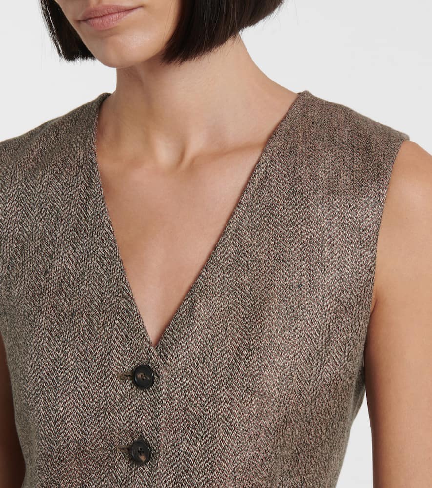 Material: 100% European Flax™. Care instructions: dry clean. Made in Italy. Designer color name: CHERRY WINE/CLEAR OY. Closure: buttoned front. Pockets: side slit pockets. Lining: 100% silk. Shop the latest Loro Piana Vests & Gilets.