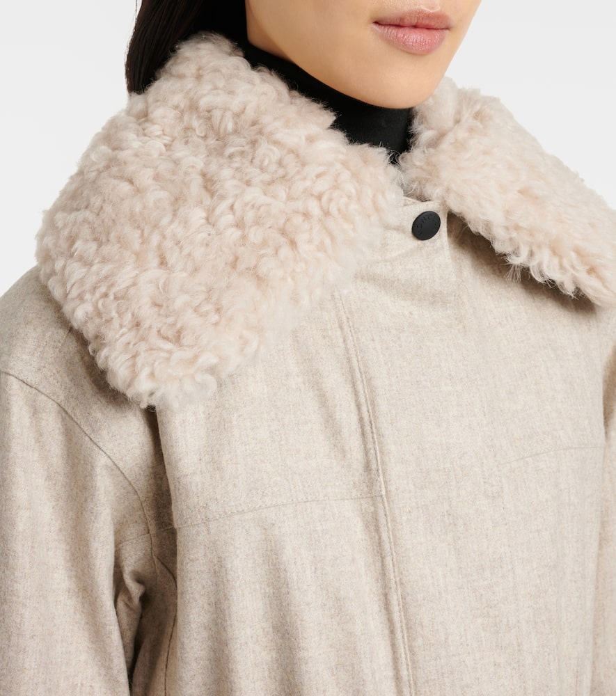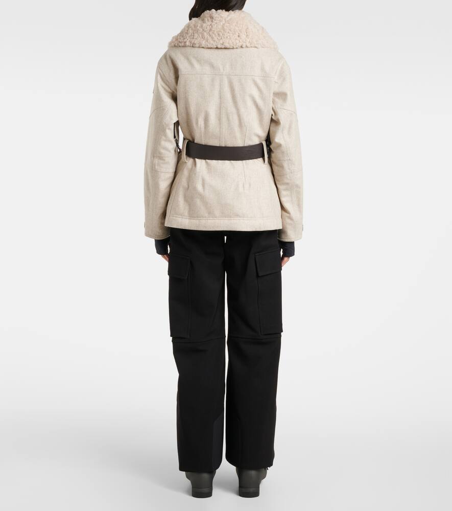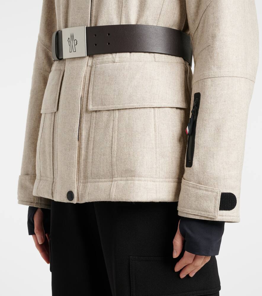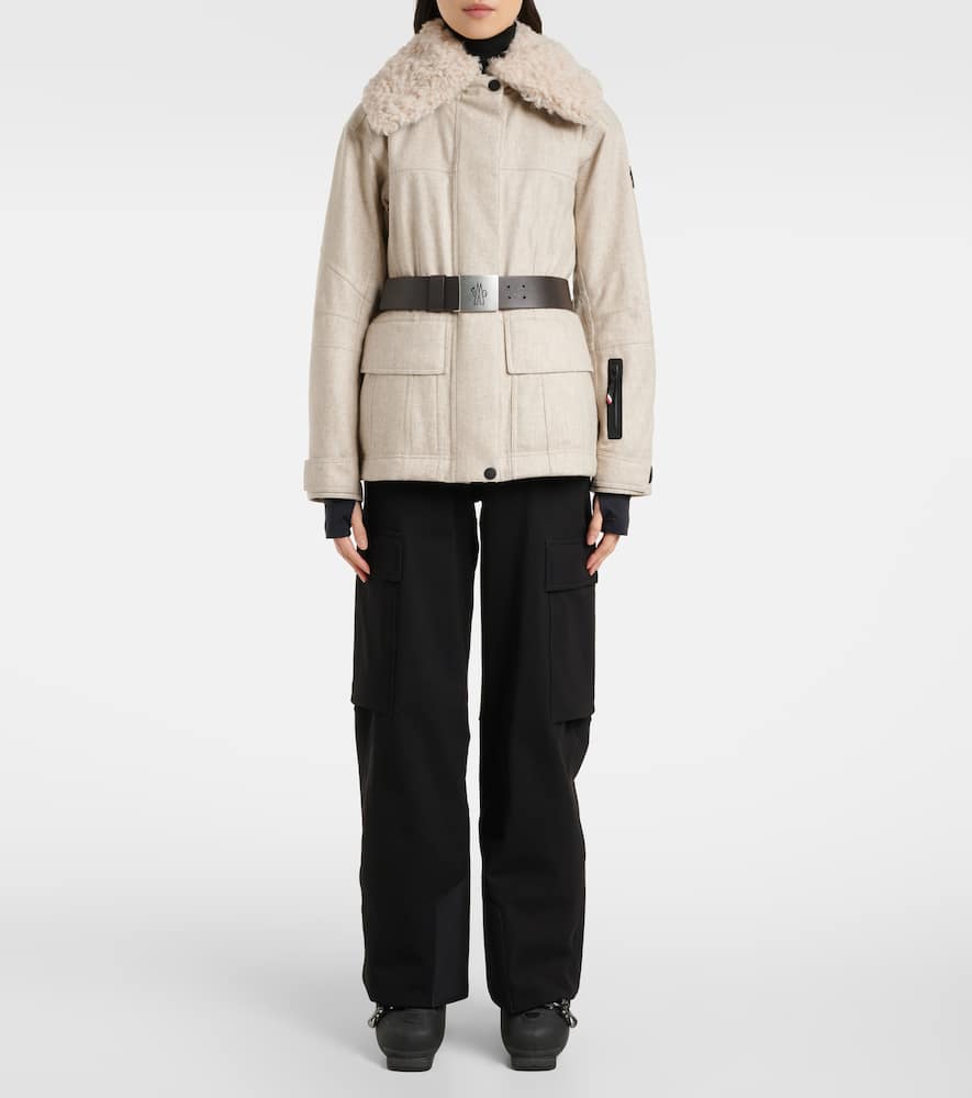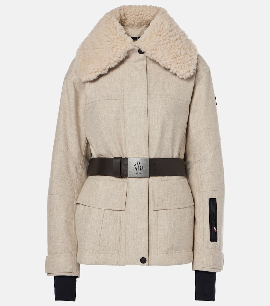 Material: 100% virgin wool. Care instructions: dry clean. Made in Romania. Designer color name: 268. Lining: 100% polyamide. Filling: 90% down, 10% feathers. Contains non-textile parts of animal origin. Trim: 100% shearling. Detachable belt. Pockets: flap pockets, sleeve pockets. Detachable collar. Closure: concealed closure. Shop the latest Moncler Grenoble Ski Jackets.