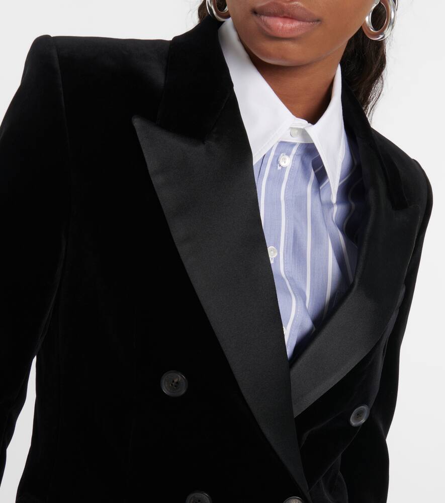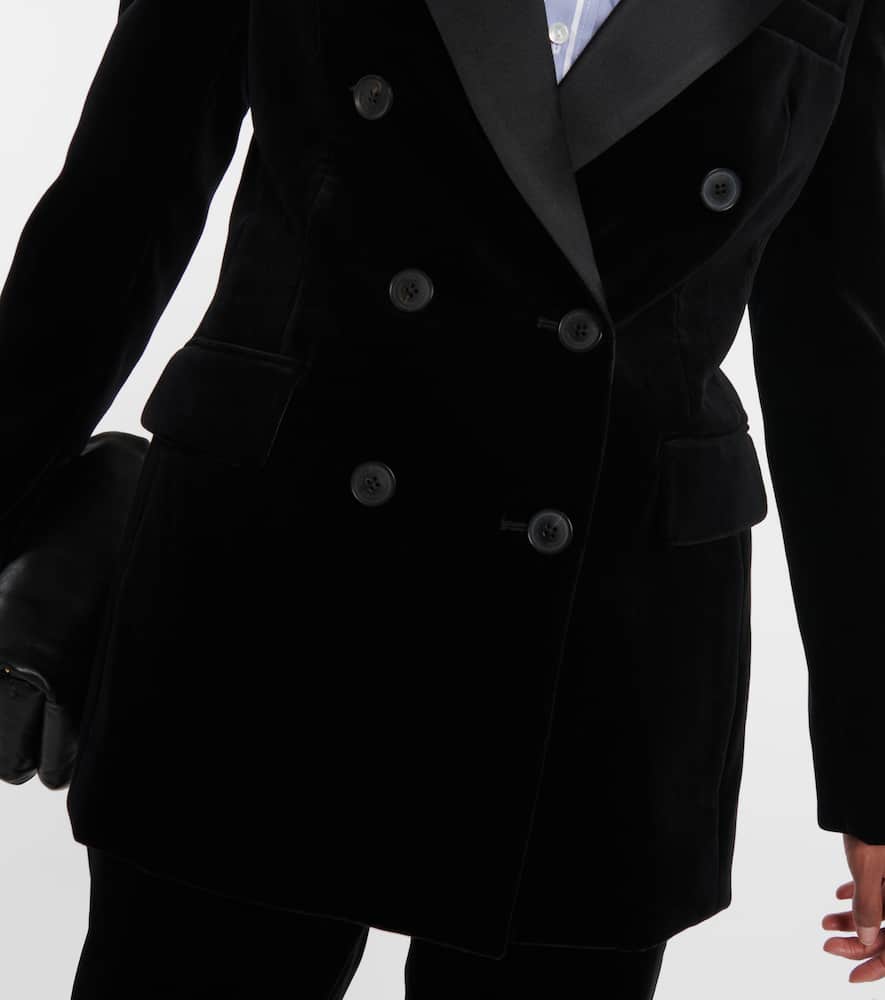 Made in the USA. Material: 2% elastane, 98% cotton. Lining: fully lined, 100% viscose. Trim: 100% silk. Pockets: flap pockets. Closure: double-breasted buttoned front. Care instructions: dry clean. Shoulder pads. Shop the latest Nili Lotan Blazers.