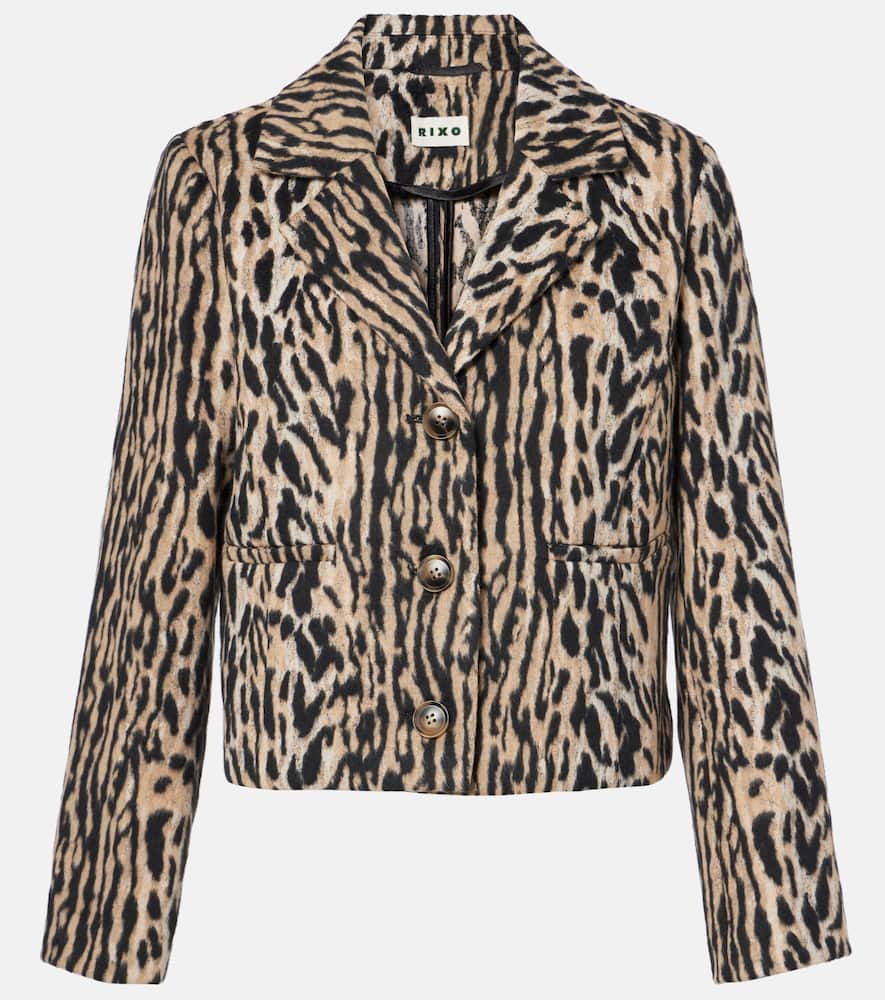 Material: 52% polyester, 46% cotton, 2% other fibres. Care instructions: dry clean. Made in Romania. Designer color name: Leopard Brown. Shop the latest Rixo Blazers.