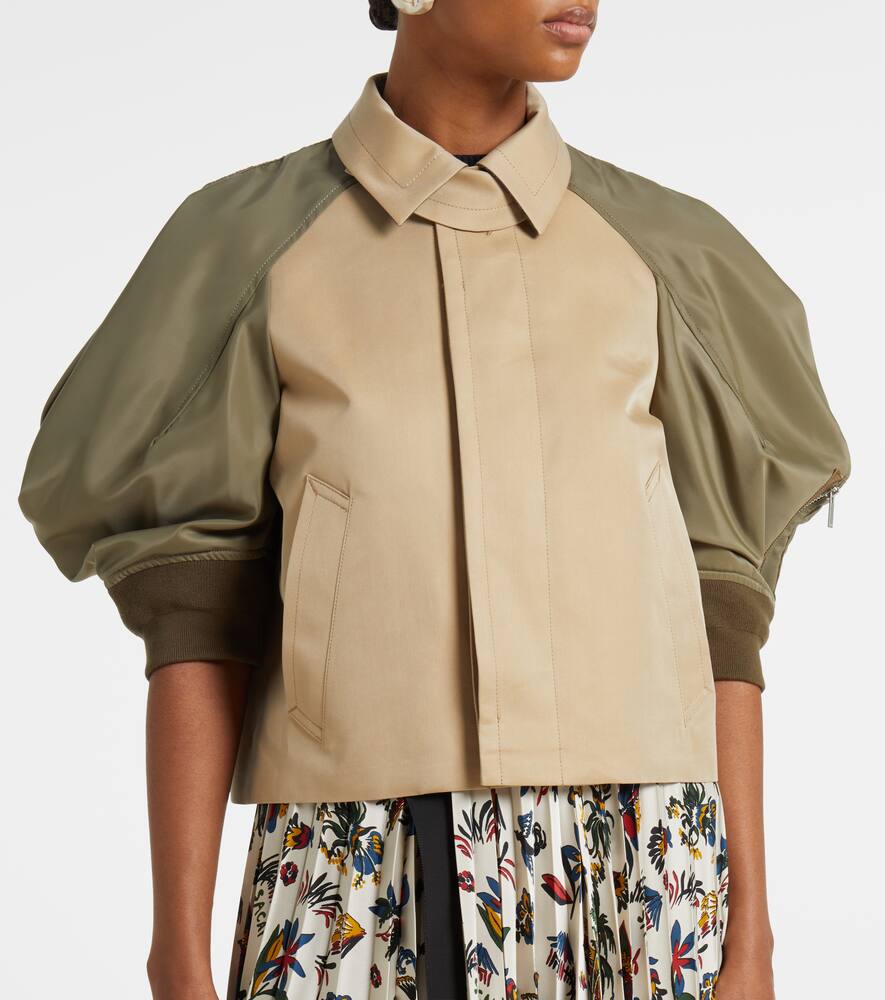 Material: 63% cotton, 37% polyester. Care instructions: dry clean. Made in Japan. Designer color name: BeigexTaupe. Lining: 100% cupro. Material II: 55% polyester, 44% cotton, 1% polyurethane. Closure: concealed button placket. Pockets: side slit pockets, sleeve pocket. Shop the latest Sacai Bomber & Track Jackets.