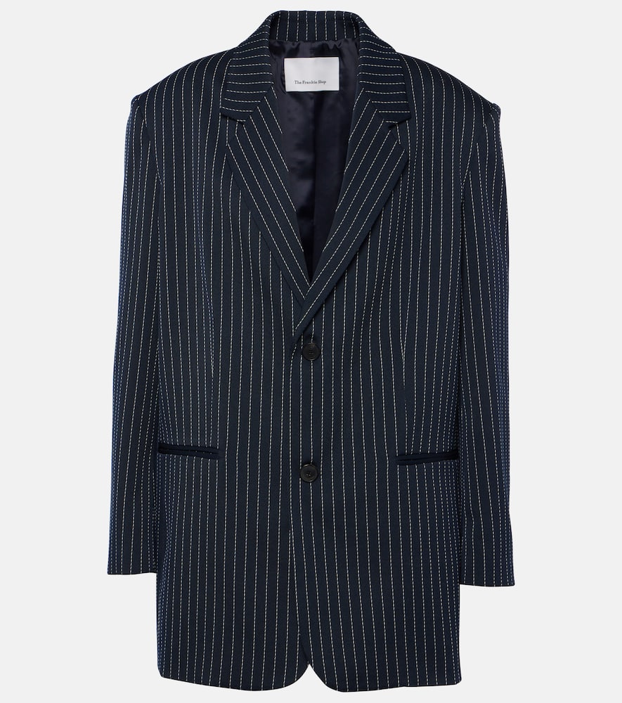Material: 59% polyester, 29% viscose, 12% wool. Care instructions: do not wash. Made in Bosnia and Herzegovina. Designer color name: Navy/ White Pinstripe. Cuff: buttoned. Closure: buttoned front. Pockets: jetted. Notched lapel. Shop the latest womens The Frankie Shop Blazers.
