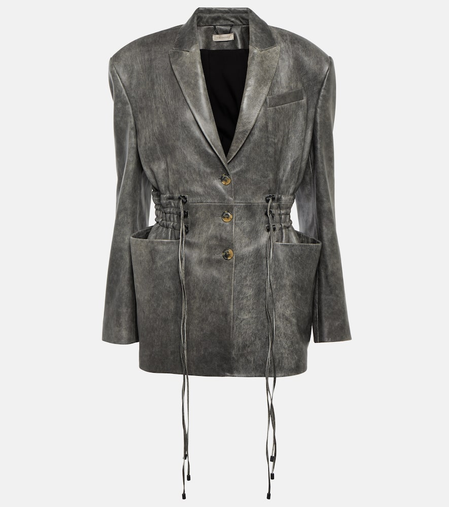 Lining: fully lined, viscose. Made in Poland. Pockets: slit pockets. Designer color name: Grey. Closure: buttoned front. Care instructions: dry clean. Material: 100% leather. Shop the latest The Mannei Blazers.