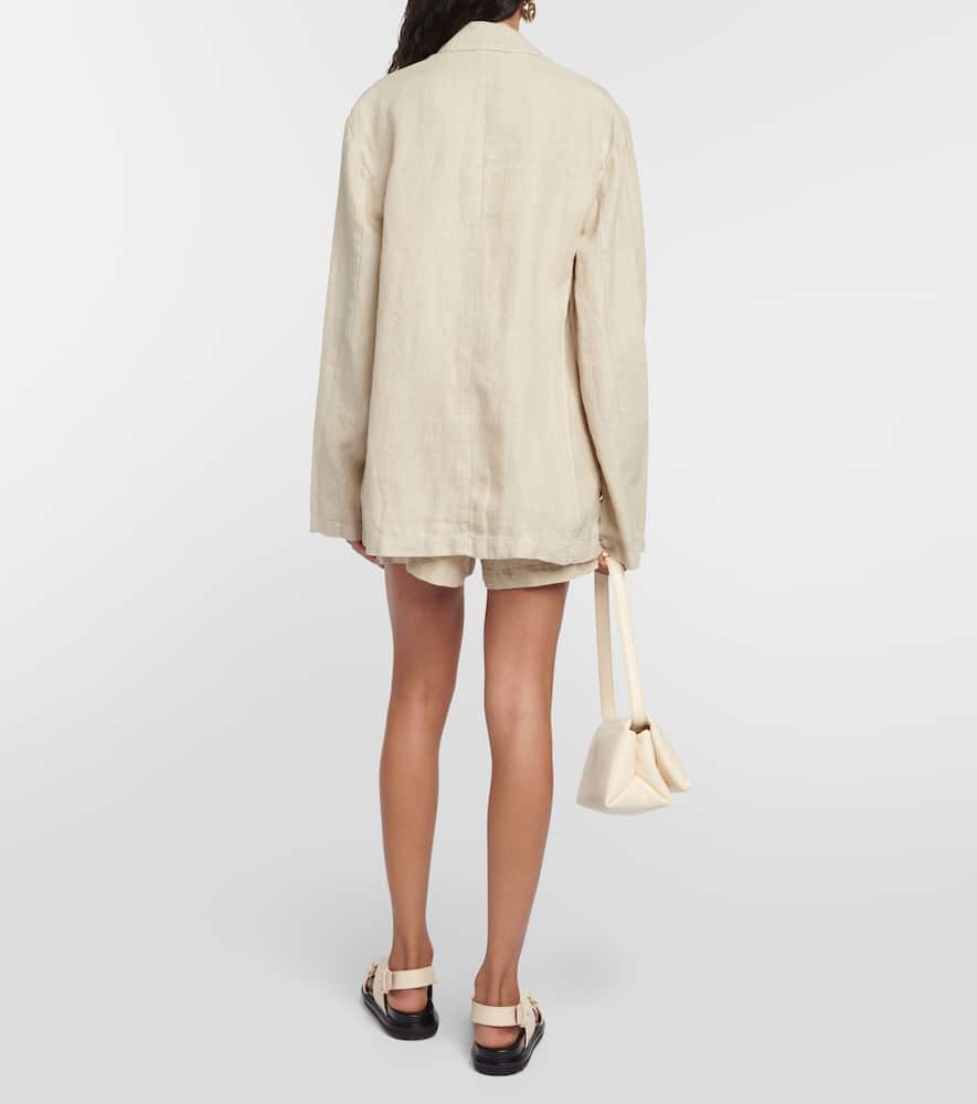 Material II: 100% cotton. Care instructions: machine wash cold. Material: 100% linen. Designer color name: Sand. Pockets: slit pockets. Made in the USA. Closure: buttoned front. Shop the latest Velvet Blazers.