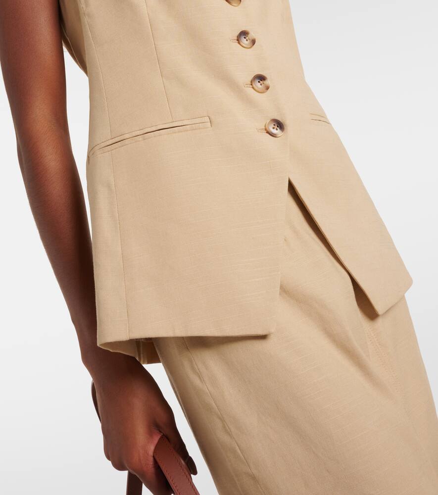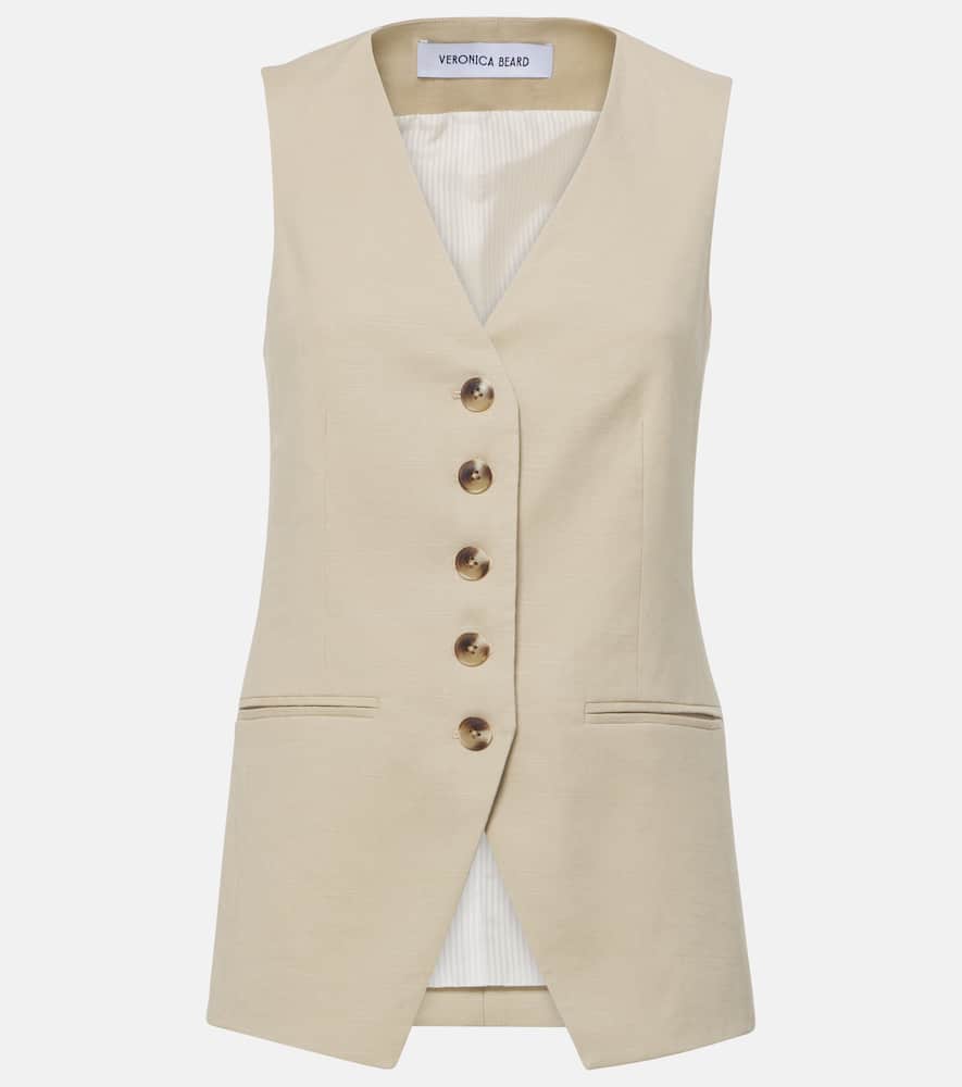 Material: 55% linen, 43% viscose, 2% elastane. Care instructions: dry clean. Made in Italy. Designer color name: Stone Khaki. Closure: buttoned front. Pockets: welt pockets. Shop the latest womens Veronica Beard Vests & Gilets.