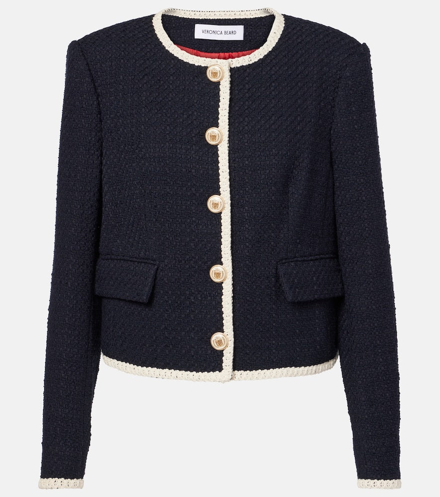 Material: 60% cotton, 38% polyester, 2% elastane. Care instructions: dry clean. Made in China. Designer color name: Navy. Closure: buttoned front. Pockets: flap pockets. Shop the latest Veronica Beard Tweed Jackets.