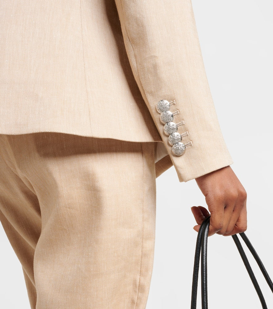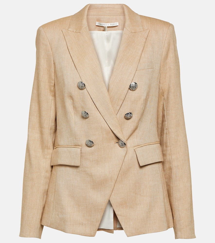 Material: 58% linen, 27% polyester, 14% viscose, 1% elastane. Care instructions: dry clean. Made in the USA. Designer color name: Khaki Melange. Lining: 96% polyester, 4% elastane. Closure: double-breasted (six buttons). Pockets: flap pockets. Shop the latest Veronica Beard Blazers.