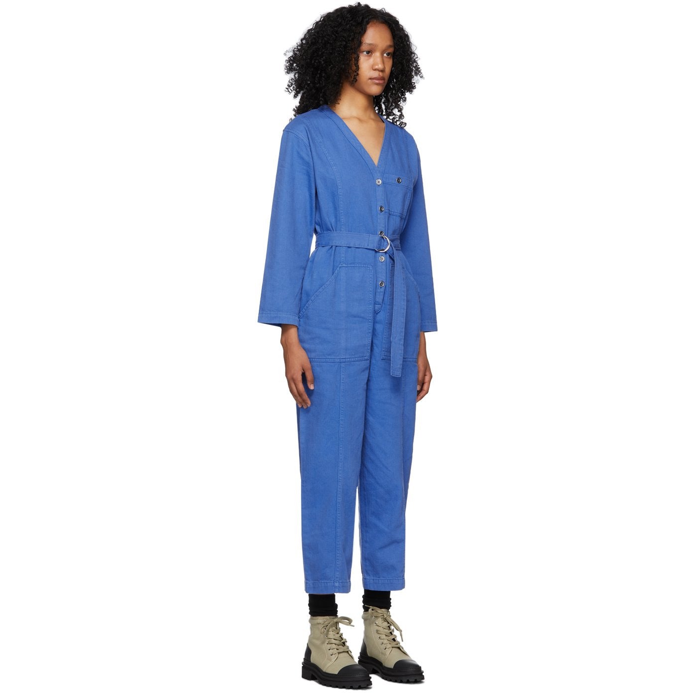 Long sleeve non-stretch denim jumpsuit in blue. Y-neck collar. Button closure at front. Patch pocket at chest. Adjustable and detachable belt with cinch fastening and belt loops at waistband. Straight-leg. Four-pocket styling. Silver-tone hardware. Supplier color: Blue 100% cotton. Brand: A.P.C.