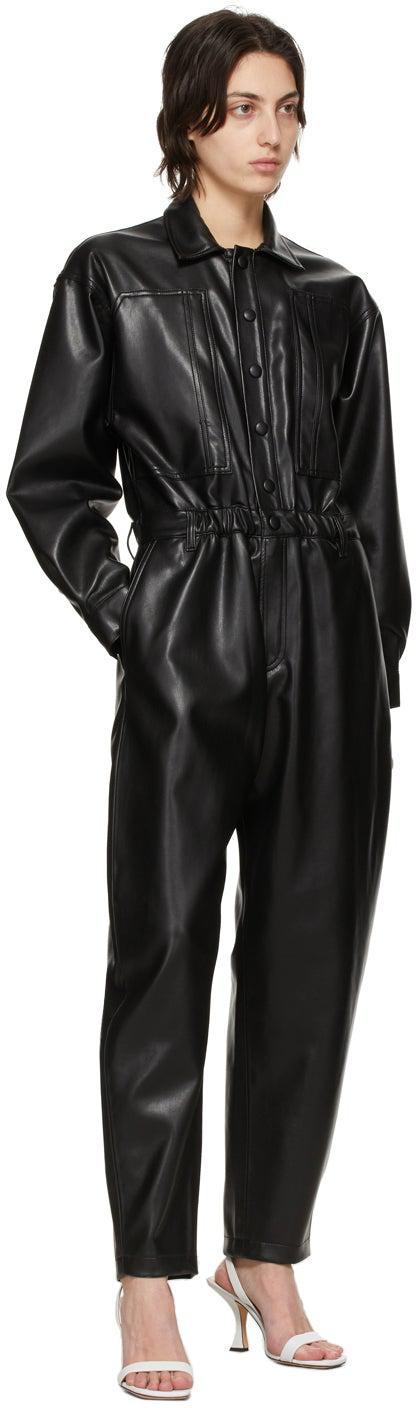 Long sleeve faux-leather jumpsuit in black. Spread collar. Press-stud closure at front. Welt pockets at chest. Two-button barrel cuffs. Twin pleats at back yoke. Relaxed-fit. Two-pocket styling. Belt loops at partially elasticized waistband. Full microsuede lining in grey. Zip-fly. Tonal and copper-tone hardware. Supplier color: Detox 55% polyester, 45% polyurethane. Brand: AGOLDE