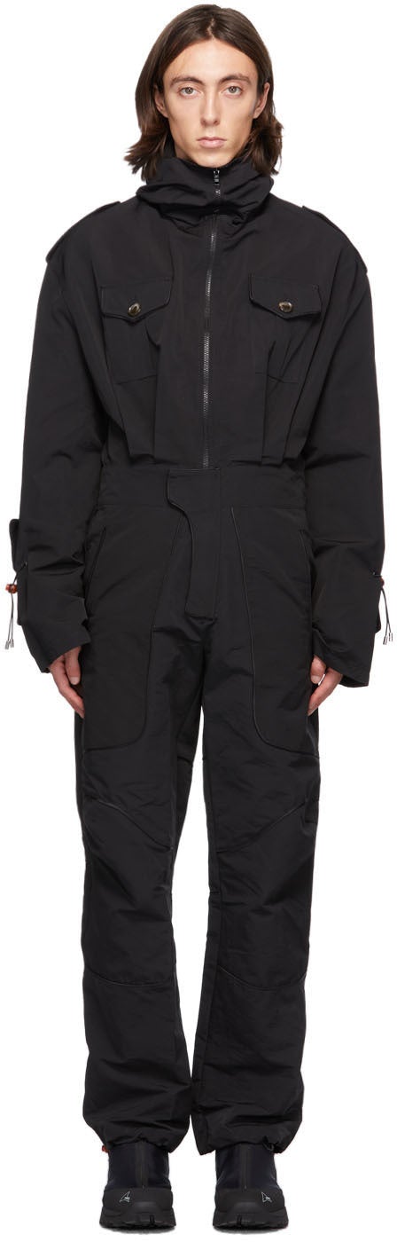 Long sleeve paneled nylon and cotton-blend jumpsuit in black. Tonal piping throughout. Brimmed hood. Partially-concealed zip closure at front. Flap pockets and pleats at chest. Buttoned epaulets. Mock flap pocket featuring bungee-style drawstring detailing at cuffs. Multicolor textile logo patch at back waist. Relaxed fit. Mid-rise. Two-pocket styling. Bungee-style drawstrings at cuffs. Unlined. Tonal, brown, and silver-tone hardware. Supplier color: Black 60% nylon, 40% cotton. Brand: Boramy Viguier