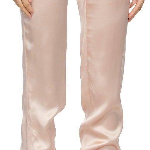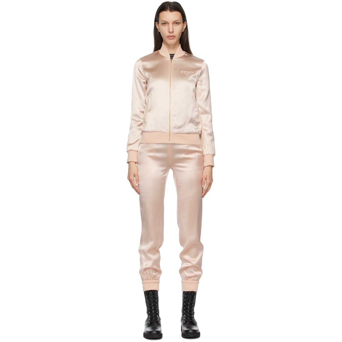 Long sleeve satin jacket in pink. Rib kit crewneck collar, cuffs, and hem. Zip closure at front. Tonal logo embroidered at front and back. Welt pockets at waist. Fully lined. Gold-tone hardware. Relaxed-fit satin lounge pants in pink. Mid-rise. Two-pocket styling. Rib knit elasticized waistband and cuffs. Tonal logo embroidered at front leg. Includes silk satin bag with logo printed in black at face. Supplier color: Pink Body: 68% acetate, 32% viscose. Lining: 100% polyester. Brand: Fendi