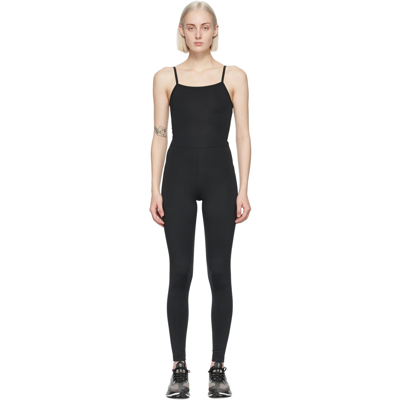 Sleeveless stretch jersey jumpsuit in black. Square-neck collar. Adjustable spaghetti straps. Tonal hardware. Supplier color: Black 79% recycled polyester, 21% spandex. Brand: Girlfriend Collective