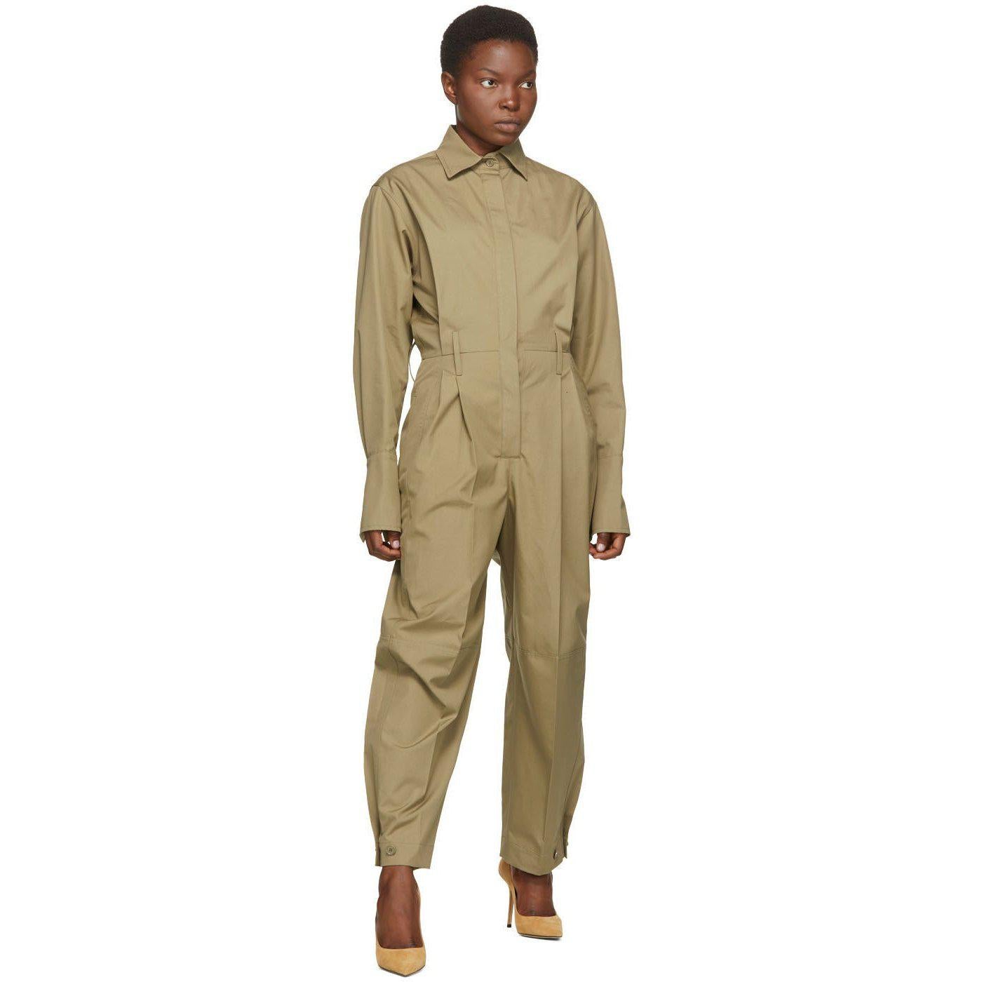 Long sleeve woven cotton jumpsuit in khaki. Pleats throughout. Spread collar. Concealed button closure at front. Belt loops at waistband. High-rise. Two-pocket styling. Three-button French cuffs. Unlined. Tonal logo engraved hardware. Supplier color: Khaki 100% cotton. Brand: Givenchy