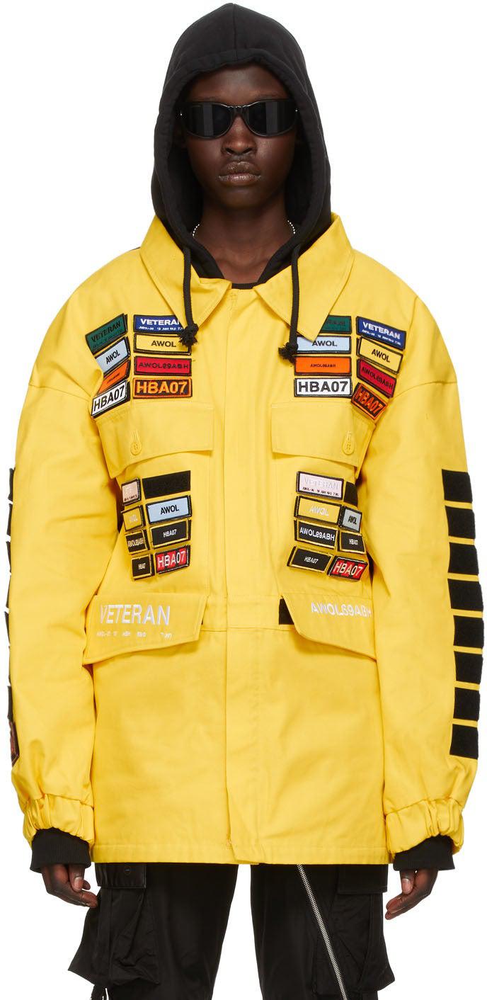 Long sleeve cotton twill jacket in yellow. Detachable Velcro graphic patches in multicolor throughout. Drawstring and cut-out at hood. Spread collar. Concealed zip closure at front. Flap pockets at chest. Logo-embroidered flap and concealed Velcro tabs at waist. Dropped shoulders. Velcro trim in black at sleeve. Adjustable Velcro tab at partially elasticized cuffs. Inset rib knit cuffs in black. Logo embroidered in white at back. Black textile logo patch and patch pockets at back waist. Patch pocket at interior. Cotton jersey lining in black. Fully lined. Silver-tone hardware. Part of the Veteran capsule collection. Supplier color: Yellow 100% cotton. Brand: Hood by Air