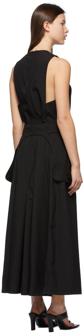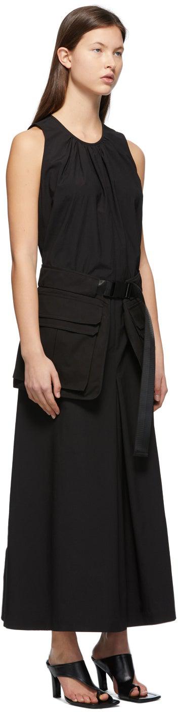 Sleeveless nylon-blend taffeta jumpsuit in black. Gathering at crewneck collar. Zip closure at back collar. Wide-leg. Detachable webbing belt featuring twin pouches and press-release buckle fastening at waistband. Gathering at back waistband. Tonal hardware. Supplier color: Black 58% rayon, 39% nylon, 3% polyurethane. Brand: Juun.J