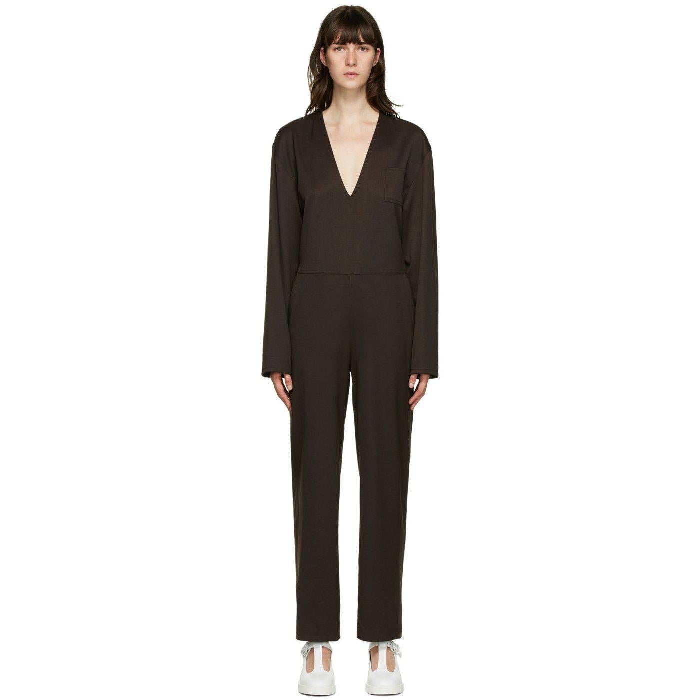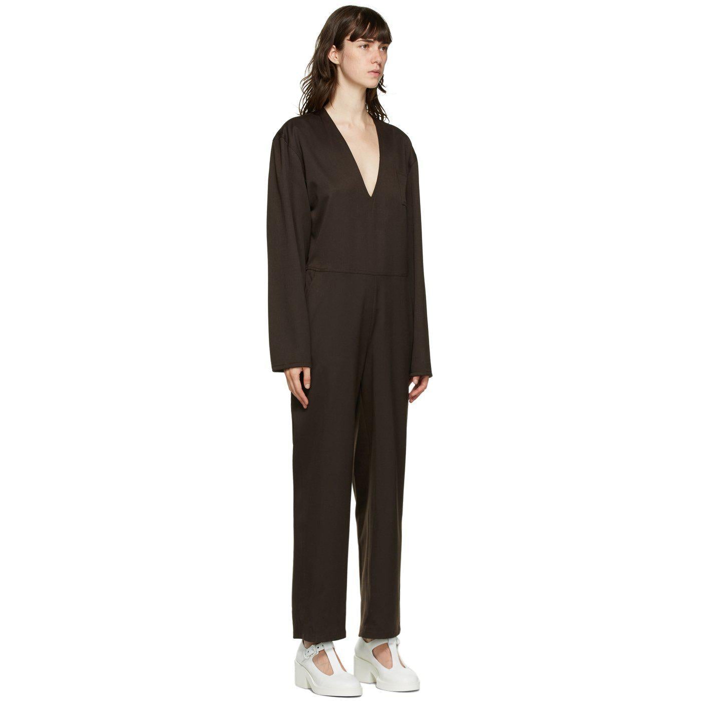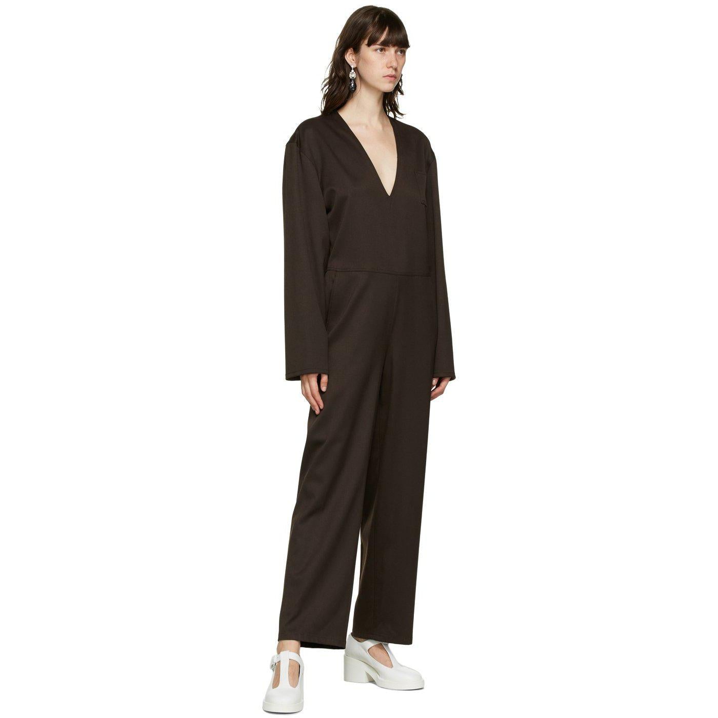 Long sleeve stretch virgin wool-blend jumpsuit in brown. V-neck collar. Zip fastening at shoulder. Patch pocket at chest. Signature stitching in white at back. Straight-leg. Mid-rise. Two-pocket styling. Unlined. Supplier color: Brown 54% polyester, 44% virgin wool, 2% elastane. Brand: MM6 Maison Margiela