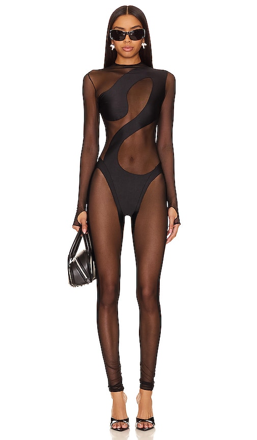 Mother of All Swan Catsuit in Black. - size L (also in M, XL, XS) Mother of All Swan Catsuit in Black. - size L (also in M, XL, XS) Nylon blend. Imported. Hand wash recommended. Hidden back zipper closure. Lightweight mesh fabric with satin paneling throughout bodice and thumbhole design. Garment is intentionally sheer, undergarments will show through. Please note undergarment not included. MFAR-WC3. 3308. Shop the latest in fashion from Mother of All