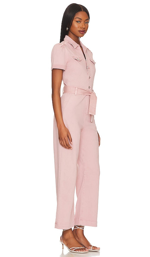 PAIGE Anessa Jumpsuit in Blush. - size 10 (also in 12, 14, 4, 8) PAIGE Anessa Jumpsuit in Blush. - size 10 (also in 12, 14, 4, 8) 57% cotton 34% rayon 6% lycra elasterell-p 3% lycra spandex. Made in China. Machine wash. Zip fly with front button closure. Faux breast pockets Side slant and faux rear pockets. Detachable waist belt. Stretch twill fabric. PAIG-WC36. 6783G29-8088. Born and raised in Los Angeles, Paige combines Southern California casual with pure sophistication. As a top fit model for denims heavy hitters Paige acquired cunning knowledge of fashion and an acute attention to detail. Paige launched her name-sake line to offer cutting edge design and trend setting styles. Shop the latest in fashion from PAIGE