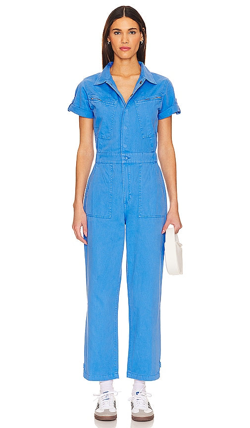 PISTOLA Campbell Aviator Flight Suit in Blue. - size L (also in M, S, XL, XS, XXS) PISTOLA Campbell Aviator Flight Suit in Blue. - size L (also in M, S, XL, XS, XXS) 100% cotton. Made in China. Machine wash. Partial snap button closure with zip fly and elastic waistband. 6-pocket styling. Twill fabric with rolled shoulder cuffs and adjustable tabs at leg cuffs. PSTL-WC79. P00071922SL BLUBL. PISTOLA is a premium denim label offering contemporary ready-to-wear collections designed with the modern woman's independent spirit in mind. Founded in 2013 by industry veteran Grace Na, Pistola skillfully blends expert cuts with a streetwise sensibility. Designed in California, PISTOLA garment is meticulously crafted, elevating everyday material with precise fits and utilitarian style edge, to give women thoughtfully designed classics as wardrobe essentials to live in. PISTOLA stands by the guiding principle that high-quality denim is for everyone, forever. Shop the latest in fashion from PISTOLA