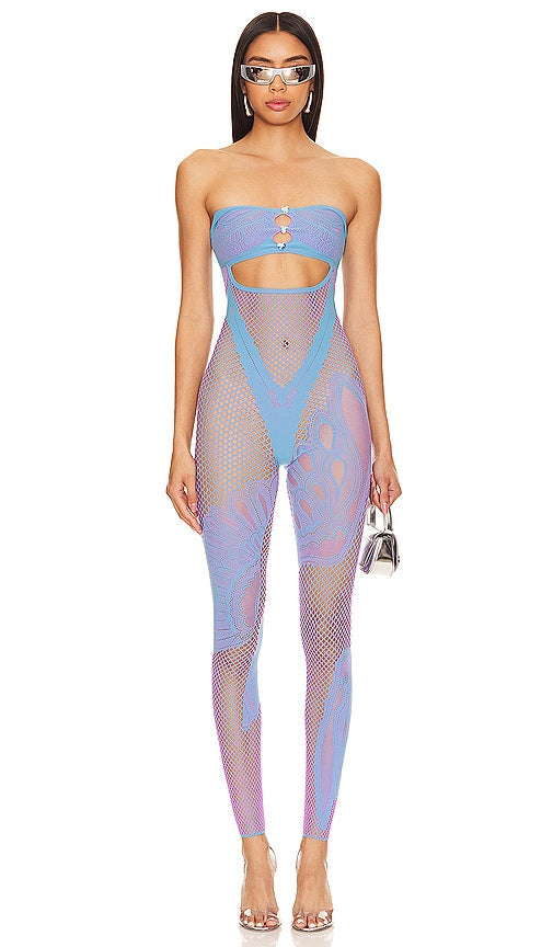 Poster Girl Risqué Jumpsuit in Blue. Poster Girl Risqué Jumpsuit in Blue. 45% polyamide 43% polyester 12% elastane. Made in Italy. Machine wash. Pull-on styling. Front cut-outs with crystal heart embellishments. Back cut-out. Lightweight sheer perforated jersey fabric. Neckline to hem measures approx 48.5 in length 6 at the knee and 6 at the leg opening. PGIR-WC12. SS24CSW137. Shop the latest in fashion from Poster Girl