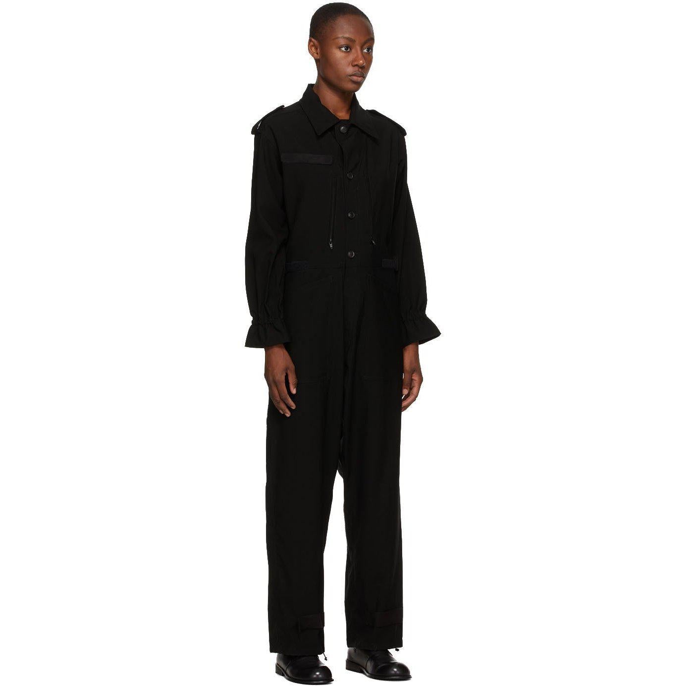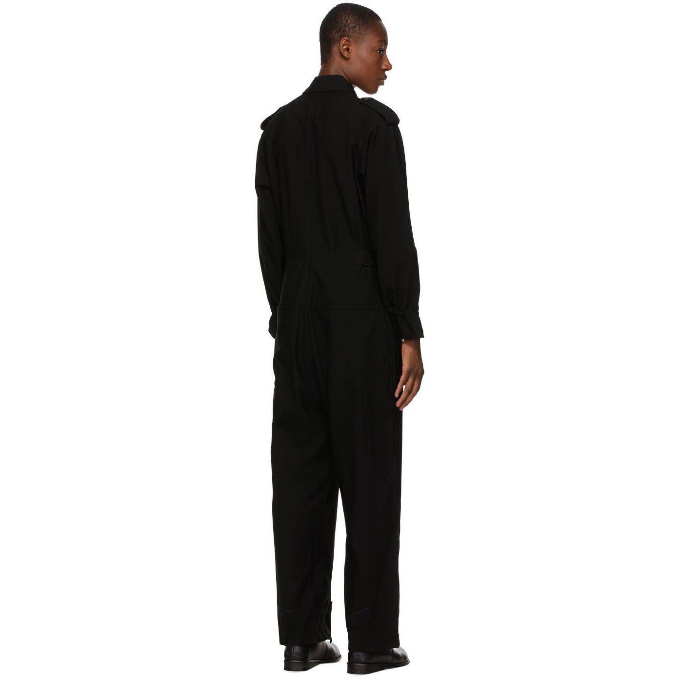 Long sleeve woven wool jumpsuit in black. Spread collar. Button closure at front. Zippered pockets and tonal Velcro appliqué at chest. Epaulets with button fastening at shoulders. Elasticized flared cuffs. Relaxed-fit. Four-pocket styling. Adjustable Velcro straps at waistband and cuffs. Patch pocket at outseam. Pleats at back waistband. Tonal logo patch at back pocket. Tonal hardware. Supplier color: Black 100% wool. Brand: Regulation Yohji Yamamoto