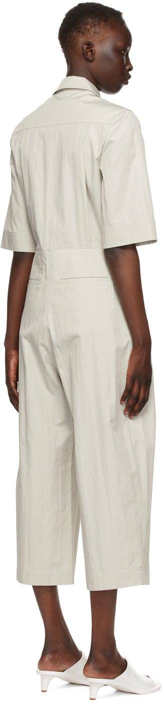 Half-sleeve cotton-blend twill jumpsuit in grey. Spread collar. Zip closure at front. Twin pleats at back yoke. Wide-leg. Four-pocket styling. Pleats at front. Patch pocket at outseam. Gunmetal-tone hardware. Supplier color: Ash 65% cotton, 35% polyamide. Brand: Studio Nicholson
