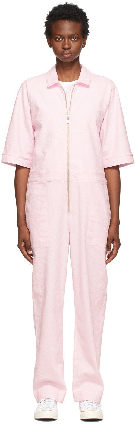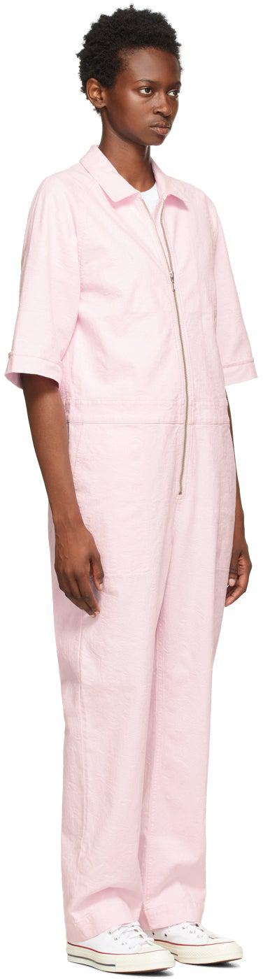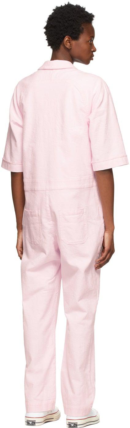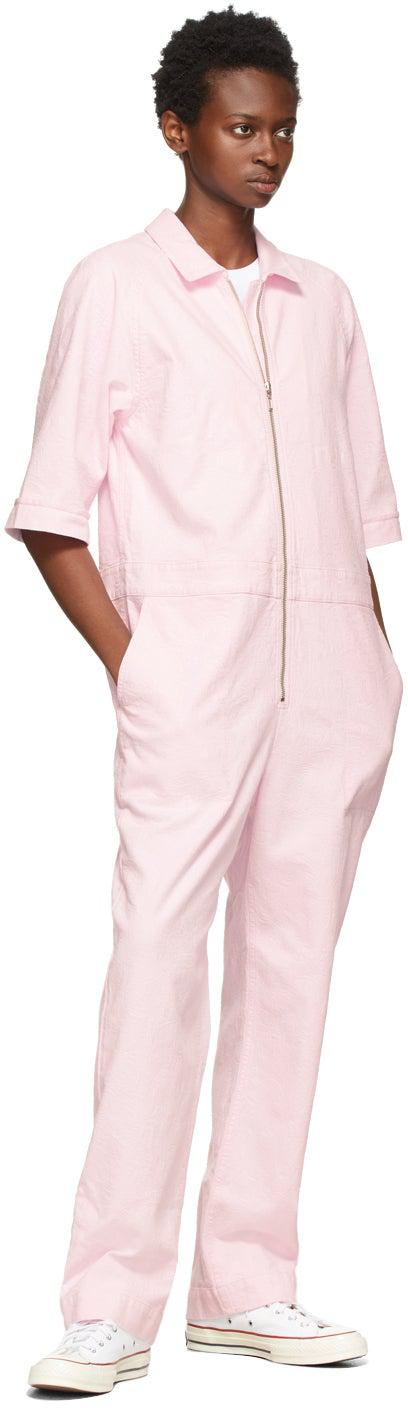 Short sleeve plain-woven stretch cotton jumpsuit in pink featuring jacquard graphic pattern woven throughout. Spread collar. Zip closure at front. Straight-leg. Four-pocket styling. Silver-tone hardware. Supplier color: Pink 98% cotton, 2% elastane. Brand: YMC