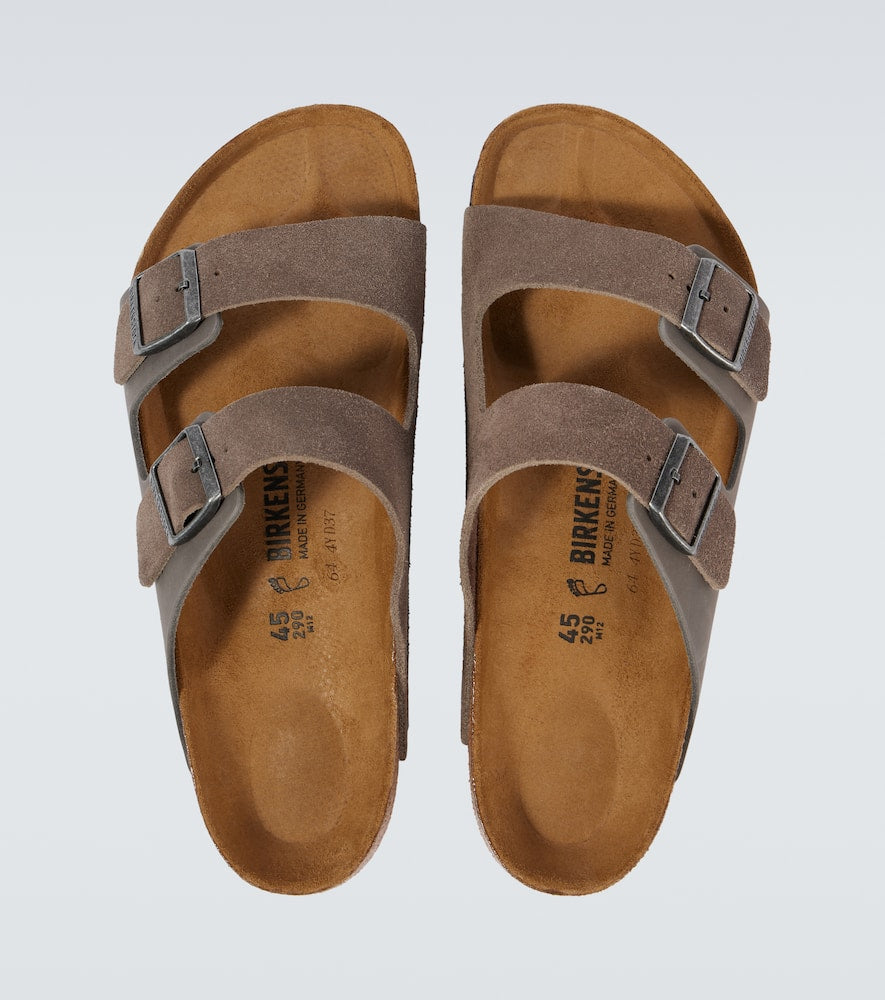 Upper: leather. Lining: leather. Sole: leather insole, rubber sole. Toe shape: round open toe. Made in Germany. Includes: shoe box. Designer color name: Concrete Gray. Closure: buckle fastening. Shop Birkenstock Sandals & Slides for men and other designer shoes now.
