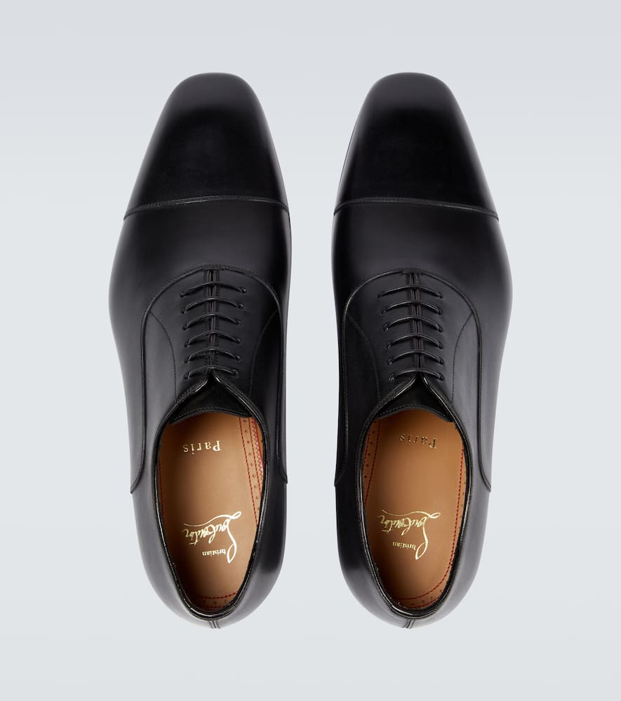 Lining: leather. Toe shape: square toe. Sole: leather insole, signature red leather sole. Upper: leather. Comes with a box. Designer color name: Black. Closure: lace-up. Made in Italy. Shop Christian Louboutin Oxford for men and other designer shoes now.
