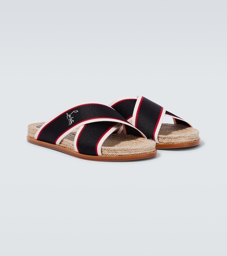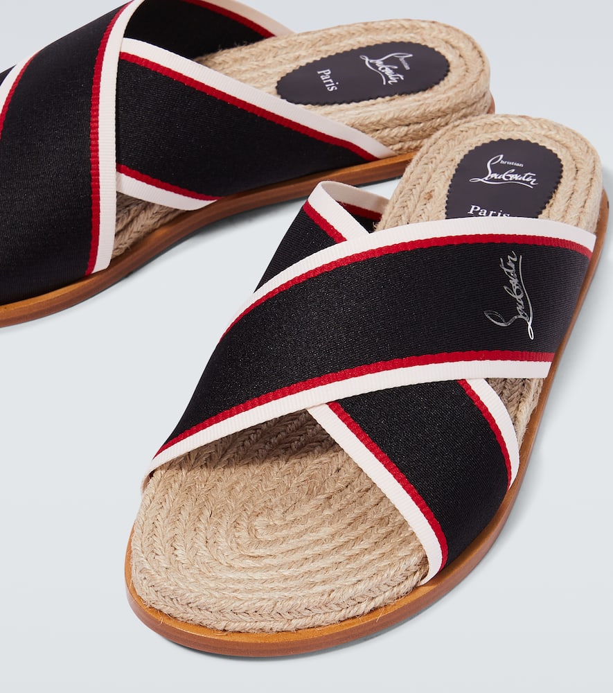 Toe shape: round open toe. Upper: fabric. Made in Spain. Comes with dust bags, Comes with a box. Designer color name: Multi/Beige. Lining: fabric. Shop Christian Louboutin Sandals & Slides for men and other designer shoes now.
