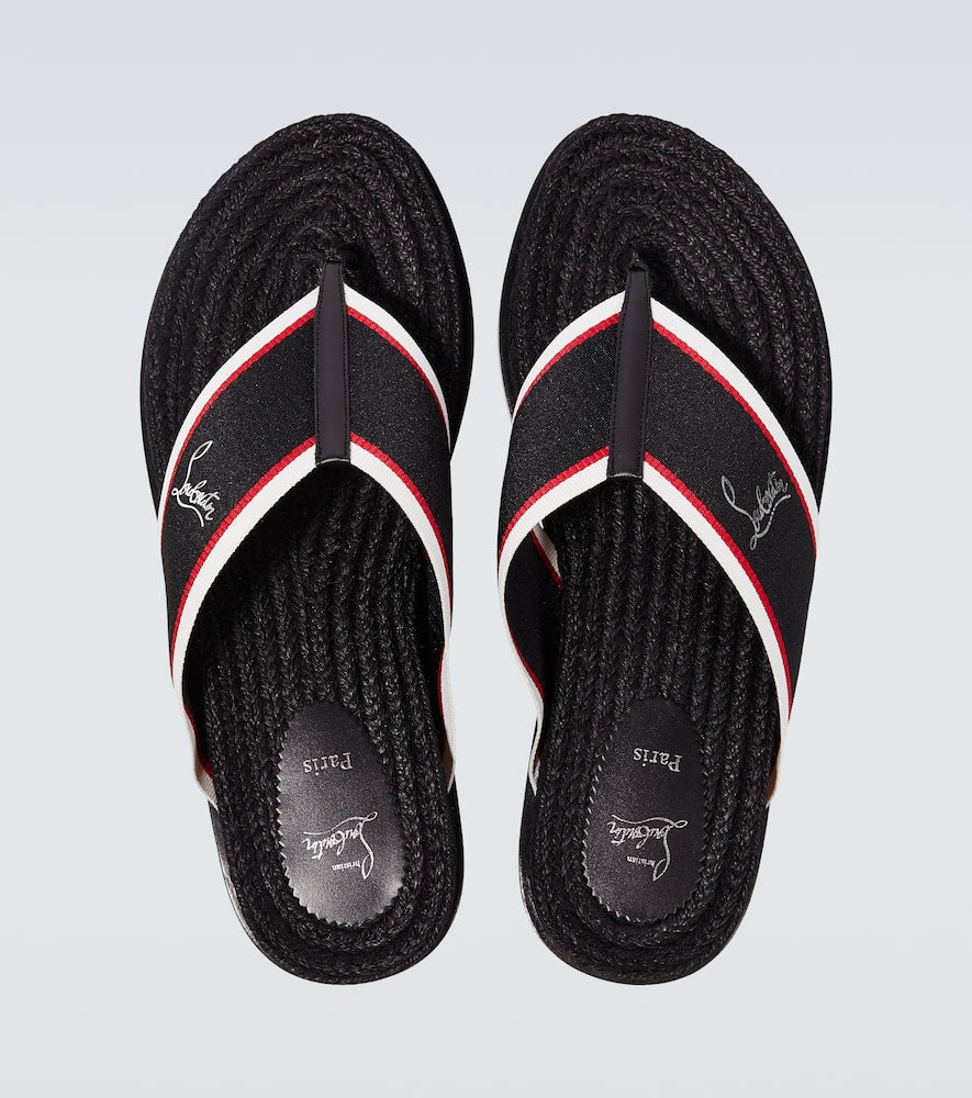Toe shape: round open toe. Upper: fabric. Trim: jute. Made in Spain. Designer color name: Multi/Black. Comes with a box, Comes with dust bag. Lining: fabric. Shop Christian Louboutin Sandals & Slides for men and other designer shoes now.