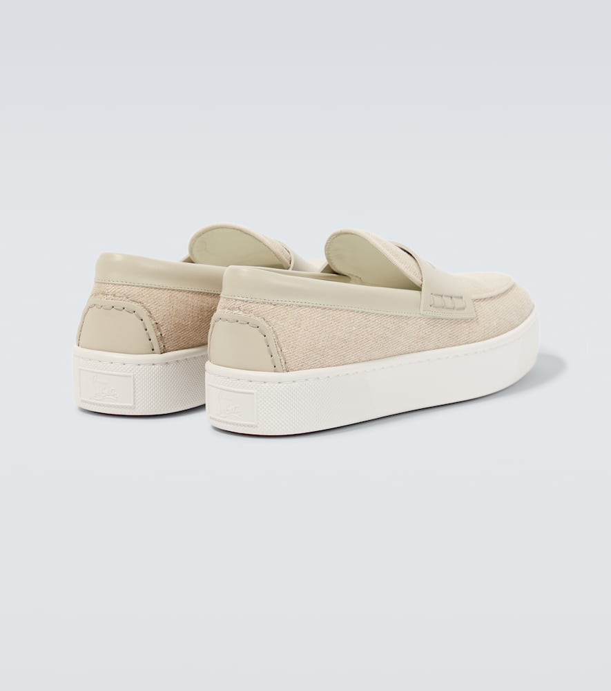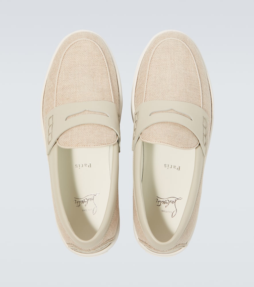 Upper: fabric, leather. Lining: leather. Sole: leather insole, rubber sole. Toe shape: almond toe. Made in Italy. Designer color name: Albatre. Comes with a box. Shop Christian Louboutin Loafers for men and other designer shoes now.