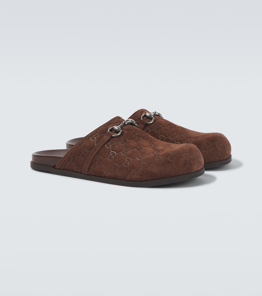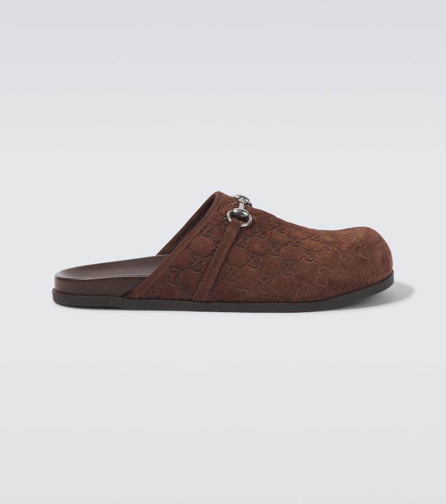 Upper: leather. Lining: leather. Sole: leather insole, rubber sole. Toe shape: almond toe. Made in Italy. Includes: shoe box, dust bags. Designer color name: Fancy Brown/ FA Brown. Hardware color: antique silver. Shop Gucci Slippers for men and other designer shoes now.