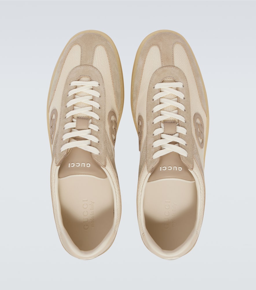 Upper: fabric. Lining: leather. Sole: leather insole, rubber sole. Toe shape: almond toe. Made in Italy. Includes: shoe box, dust bags, extra laces. Designer color name: OAT/N.IV/OAT/OAT/N.I. Closure: lace-up. Shop Gucci Low-Top Sneakers for men and other designer shoes now.