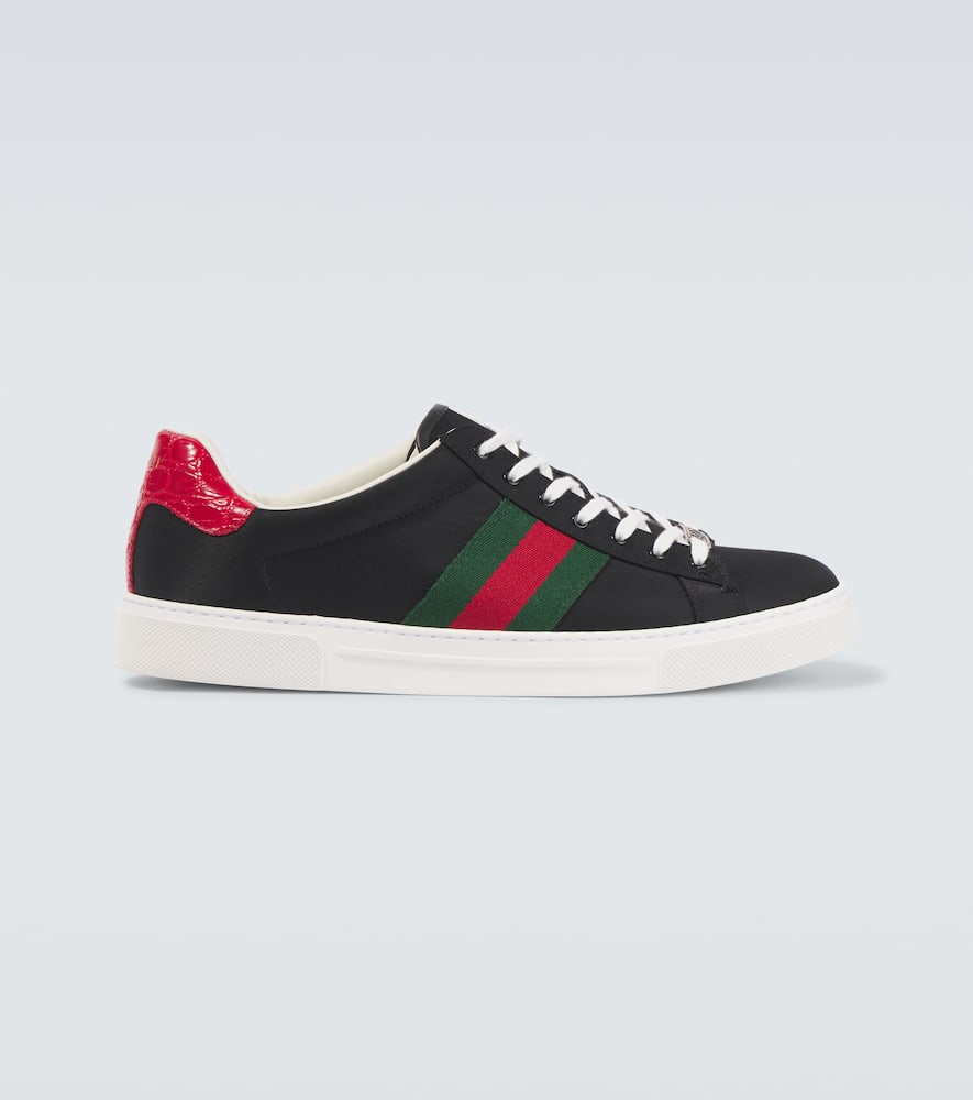 Upper: fabric. Lining: fabric. Sole: fabric insole, rubber sole. Toe shape: round toe. Made in Italy. Includes: shoe box. Designer color name: Black/Vrv/Black/Hi.R. Trim: leather. Shop Gucci Low-Top Sneakers for men and other designer shoes now.